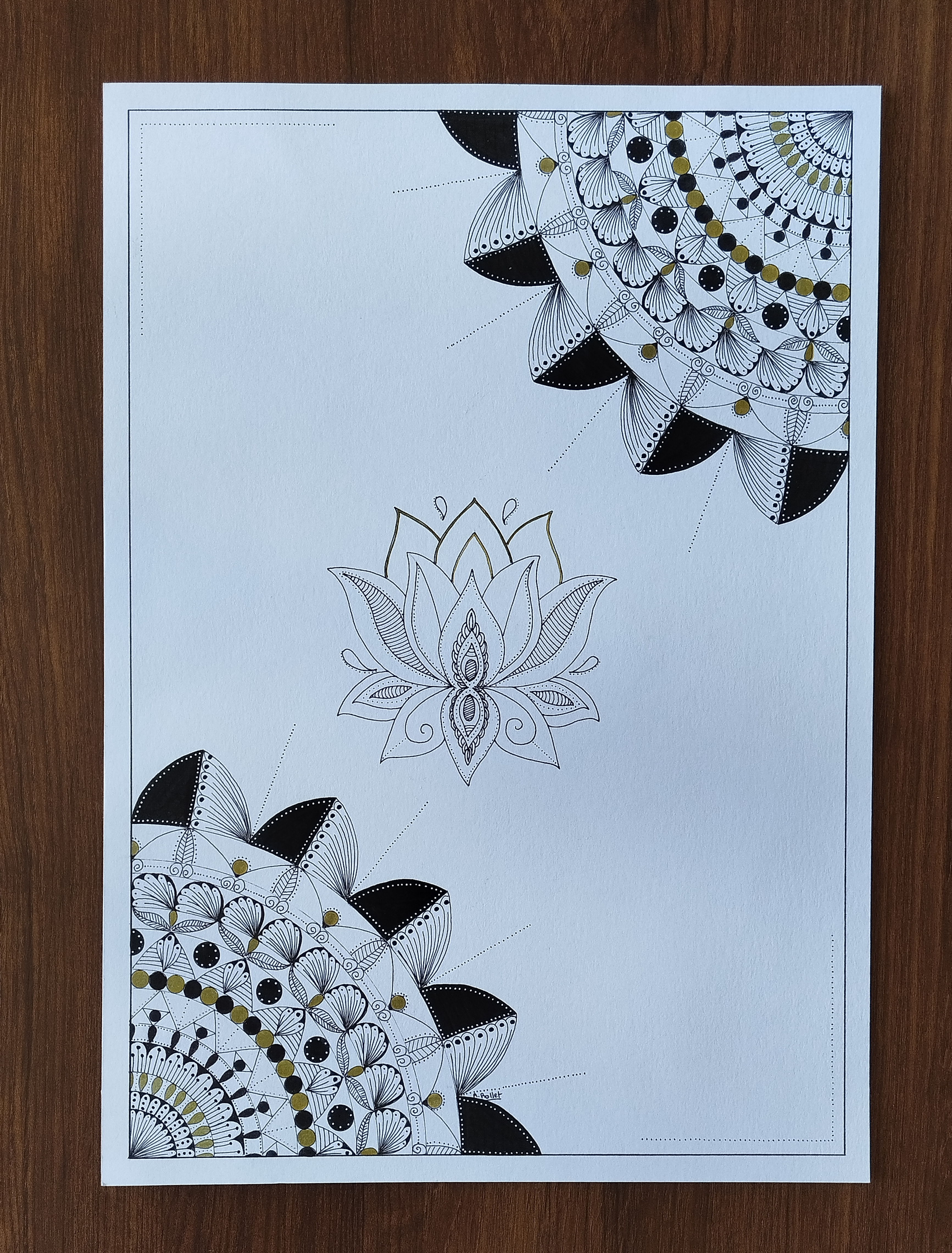 Matériel: Feutre fin noir, stylo gel or et blanc
