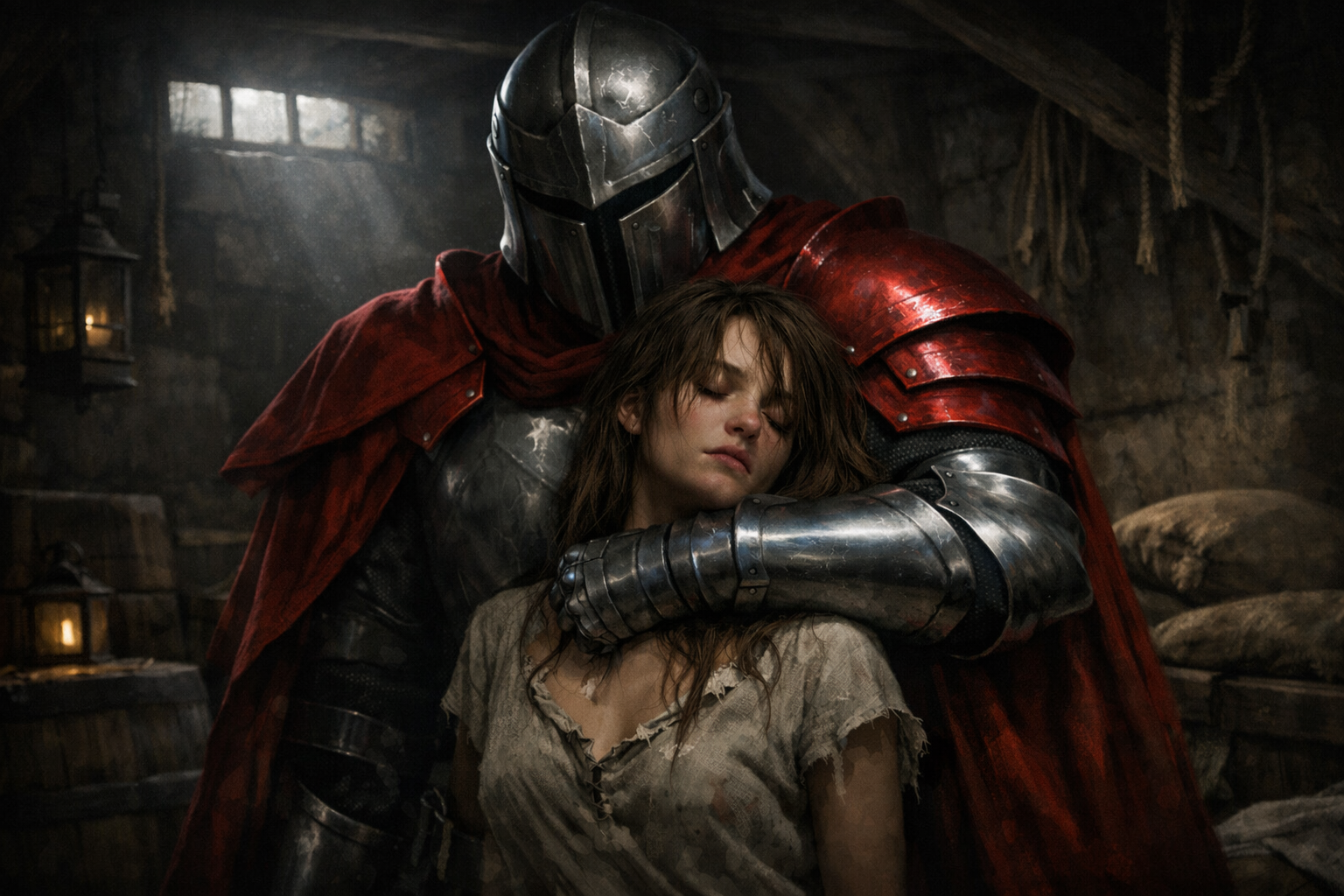 Puis, d’un geste brusque et rageur, il finit par relâcher son étreinte. Eldria inspira avec avidité l’air salvateur, mais cette bouffée d’oxygène soudaine provoqua aussitôt une violente quinte de toux sèche. Elle se recroquevilla instinctivement sur l’établi, le visage enfoui dans ses mains tremblantes, cherchant à calmer sa respiration devenue douloureuse. Pendant ce temps, son agresseur remit lentement en place son armure couverte d’huile, comme si de rien n’était. Puis, avec un calme froid, il alla déverrouiller la porte que son collègue continuait de marteler avec acharnement.