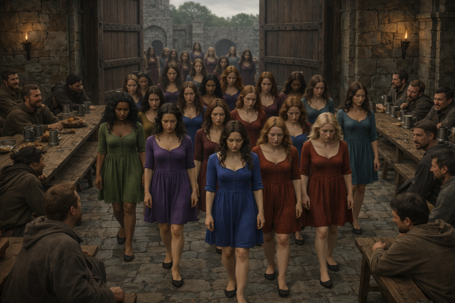 Ce fut un véritable guet-apens. Attablés autour de longues tables en bois rongé, des dizaines d’hommes arboraient un large sourire, accueillant les nouvelles arrivantes avec un plaisir non dissimulé. Les captives, n’ayant nulle part où s’enfuir, continuèrent de s’avancer entre les tables. Avec horreur, Eldria constata que des hommes se saisissaient au hasard de certaines de ses consœurs, les attrapant sans ménagement par la robe pour les attirer à eux. Certains les faisaient asseoir sur leurs genoux en ricanant, d’autres les conduisaient hors de vue d’une poigne impatiente.