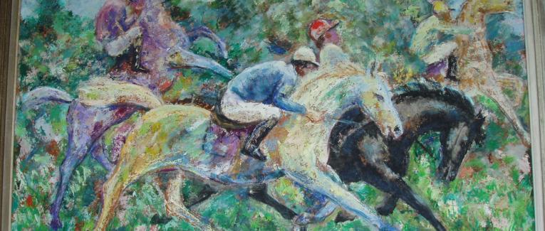 Image d’un grand tableau de mon père, représentant une course de chevaux, pour illustrer la compétition lors d’un parcours d’embauche