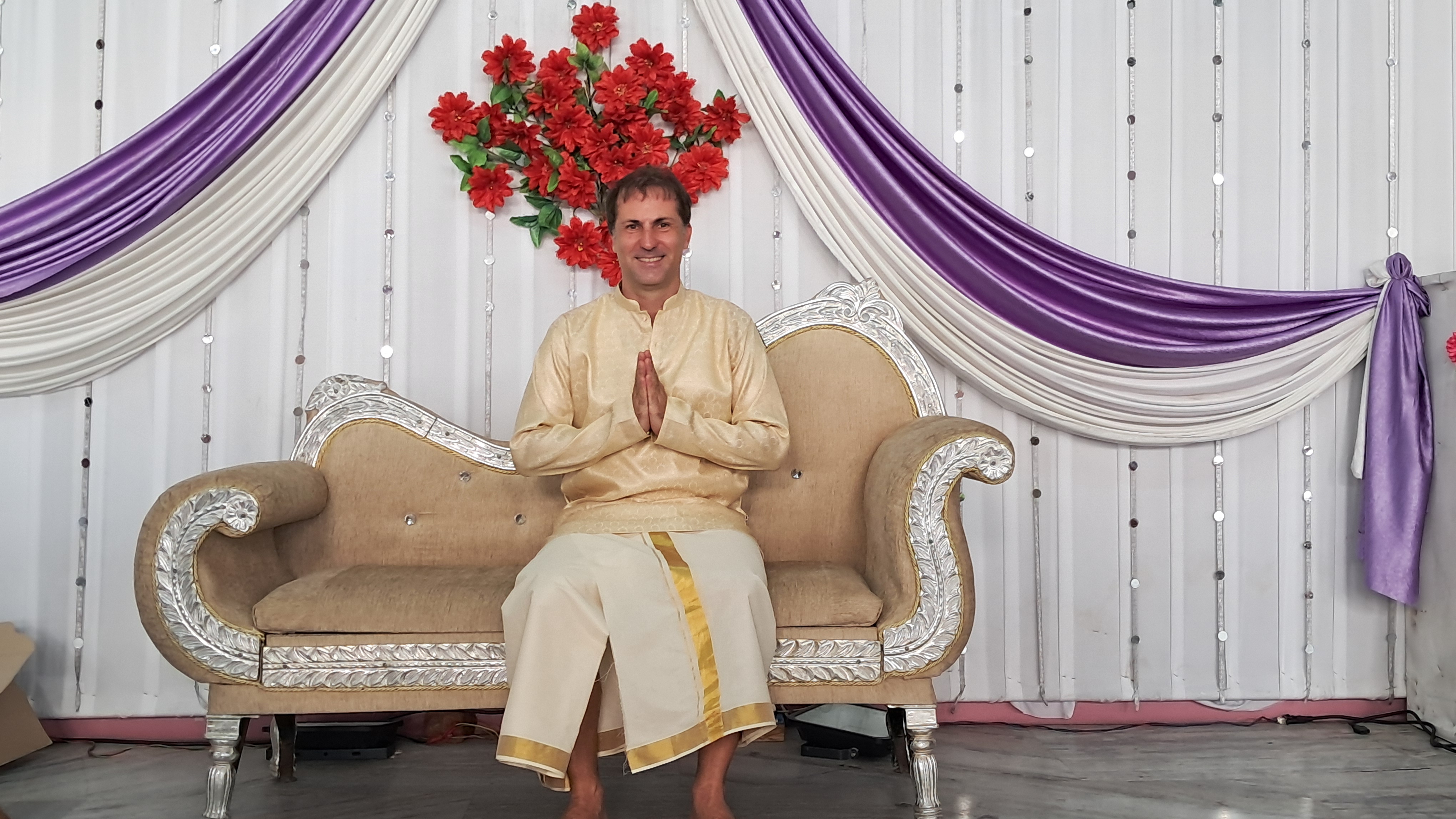 Le marié, vêtu d'un seul dhoti jaune ( une pièce de tissu de 2m nouée autour de la taille, le « pantalon » des indiens du sud) et ses parents sont ainsi guidés par le prêtre durant toute la cérémonie afin d'exécuter un long et très complexe rituel, que je ne saurais vous expliquer en détail, qui dure environ 2h. Des musiciens accompagnent le prêtre durant tout le déroulé de la cérémonie, alors qu'il récite au micro des invocations sacrées.