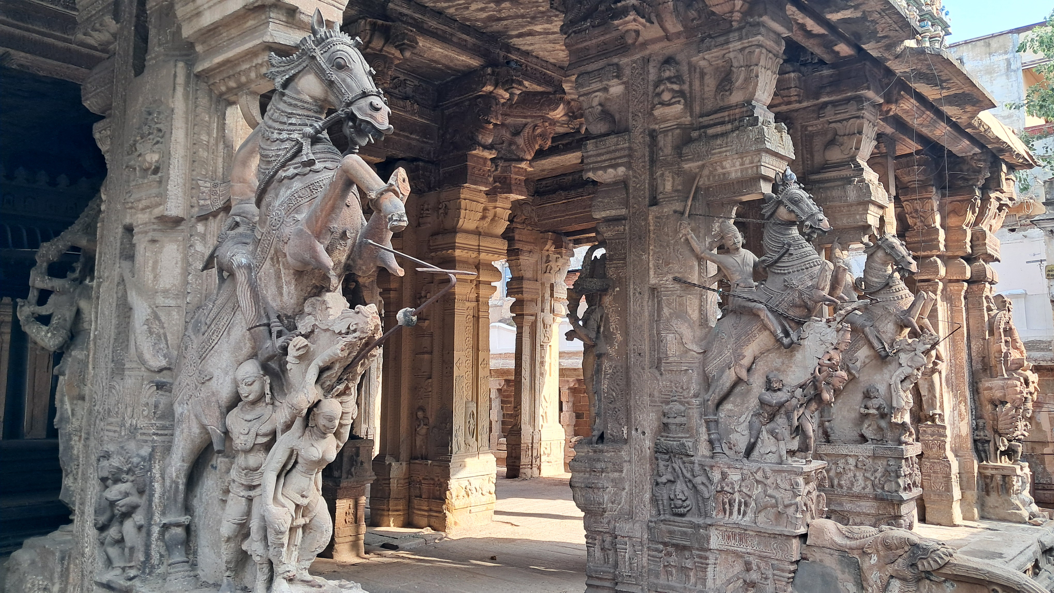 Il se caractérise par des hautes tours très colorées qu'on retrouve aux entrées appelés gopuras, comprenant d'innombrables statues de divinités et de démons (malheureusement tous les gopuras sont en rénovation actuellement) ; des grandes salles intérieures aux piliers de pierre très richement sculptés, les mandapas, représentant systématiquement une sorte de dragon/lion mangeant sa queue ; et un ensemble d'enceintes imbriquées les unes dans les autres, les prakarams, qu'il faut franchir avant d'atteindre la dernière niche où loge la divinité principale, devant laquelle les hindous viennent chercher le darshan, la bénédiction. Je vous en avais déjà parlé dans mon dernier article à Kanyakumari.