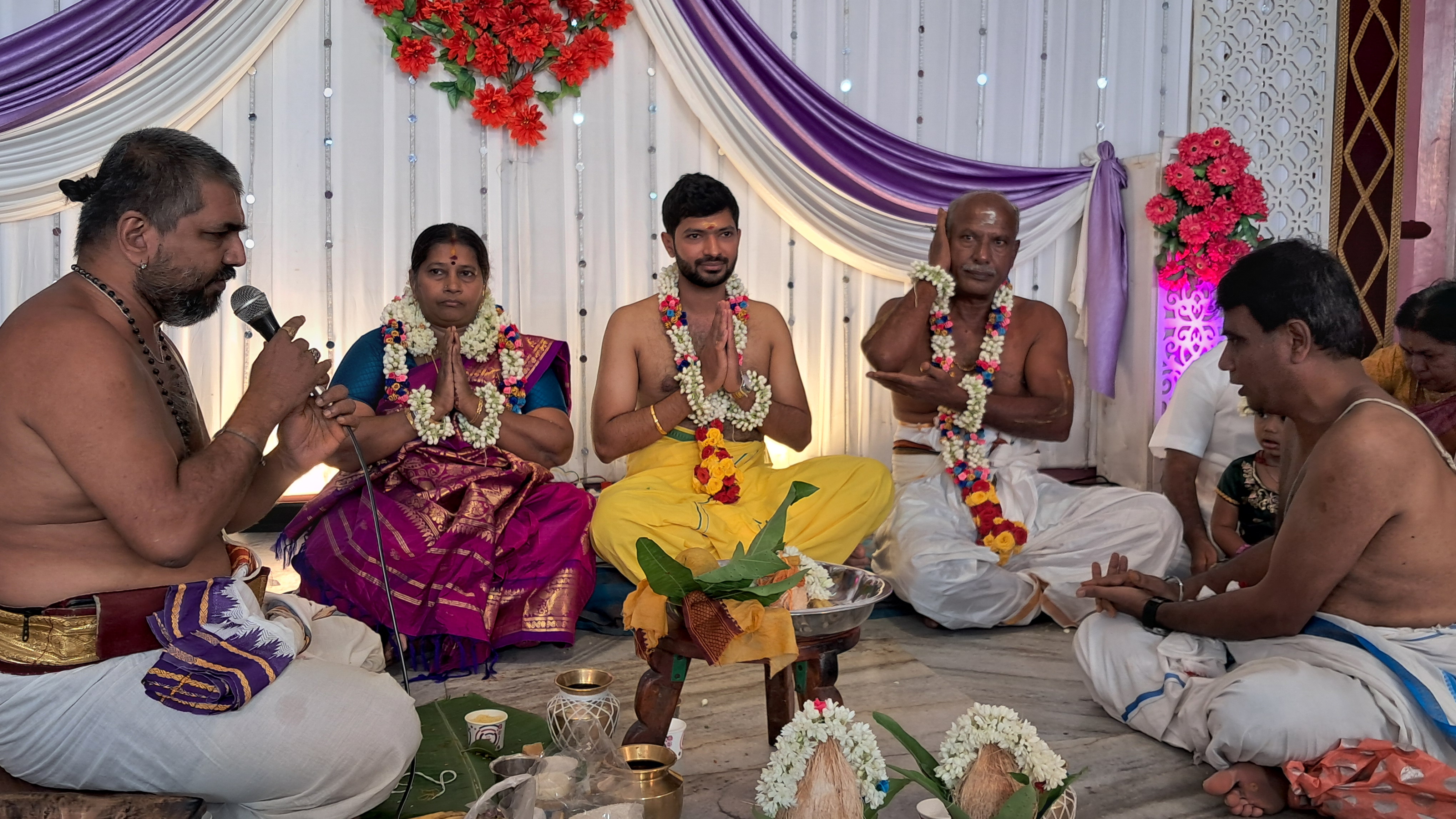 La cérémonie est officiée par un prêtre et son assistant, qui dispose devant lui un certain nombre d'éléments qui vont participer du rituel : du riz, des noix de cocos, des pots d'eau et de lait, des fleurs, des colliers et bracelets de jasmin, des poudres colorées, des morceaux de bois et notamment de bois de santal, des plateaux argentés, des bougies et des lampes à huile....