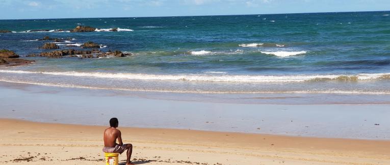 J’observe et je m’imprègne de la vie des brésiliens vaquant à leurs occupations une dernière fois : pêcheurs rafistolant leurs filets ou pêchant à la ligne, les pieds dans l'eau, sans canne. Sportifs de l’aube et nettoyeurs de plages matinaux. Ceux qui installent tables en plastique et parasols avant l’arrivée des plagistes. Rares baigneurs, surtout les enfants qui jouent au bord de l’eau. La frénésie du marché et des petits vendeurs en tout genre à chaque coin de rue. Ceux qui sont juste là, assis sur un banc ou accoudés à un boui boui, regardant le temps passer, ou absorbés par le balai des vagues qui vont et viennent s’évanouir sur le bord de la plage. Les cocotiers dans le vent, le vent soufflant sur mon visage. La ville de Salvador, dense et compacte, en toile de fond. La chaleur du soleil qui démarre son cycle de la journée. Ainsi continue la vie au Brésil, dans un renouvellement perpétuel et évolutif au gré du temps.