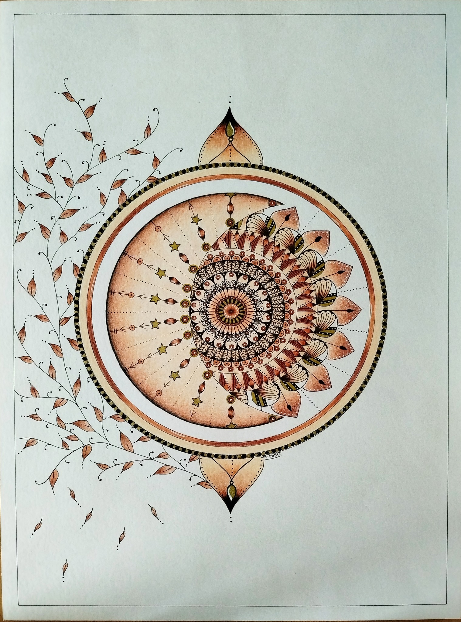 Matériel: Feutre fin noir, stylo gel or et blanc, crayons de couleurs