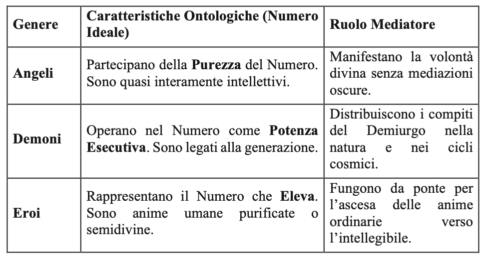 - Le Anime Divine e i Generi Superiori: Angeli, Demoni ed Eroi possiedono numeri più vicini all’Unità. La loro struttura è definita da una “monade” che non si frammenta mai del tutto. Essi sono esseri “sempre-connessi” all’intellegibile.