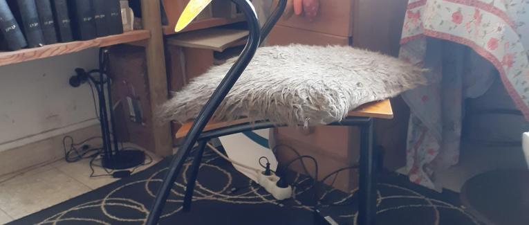 Ah....! J'ai un message? de Georges Manadis? Ah...regard de l'amoureux en fuite vers le sofa...posage de fesses endormies sur la chaise prototype trouvée chez Emmaüs, trop belle, 10 ou 5 euros la chaise, on n'en a pris que deux, parce qu'on ne pouvait pas en mettre plus dans la mini-voiture.