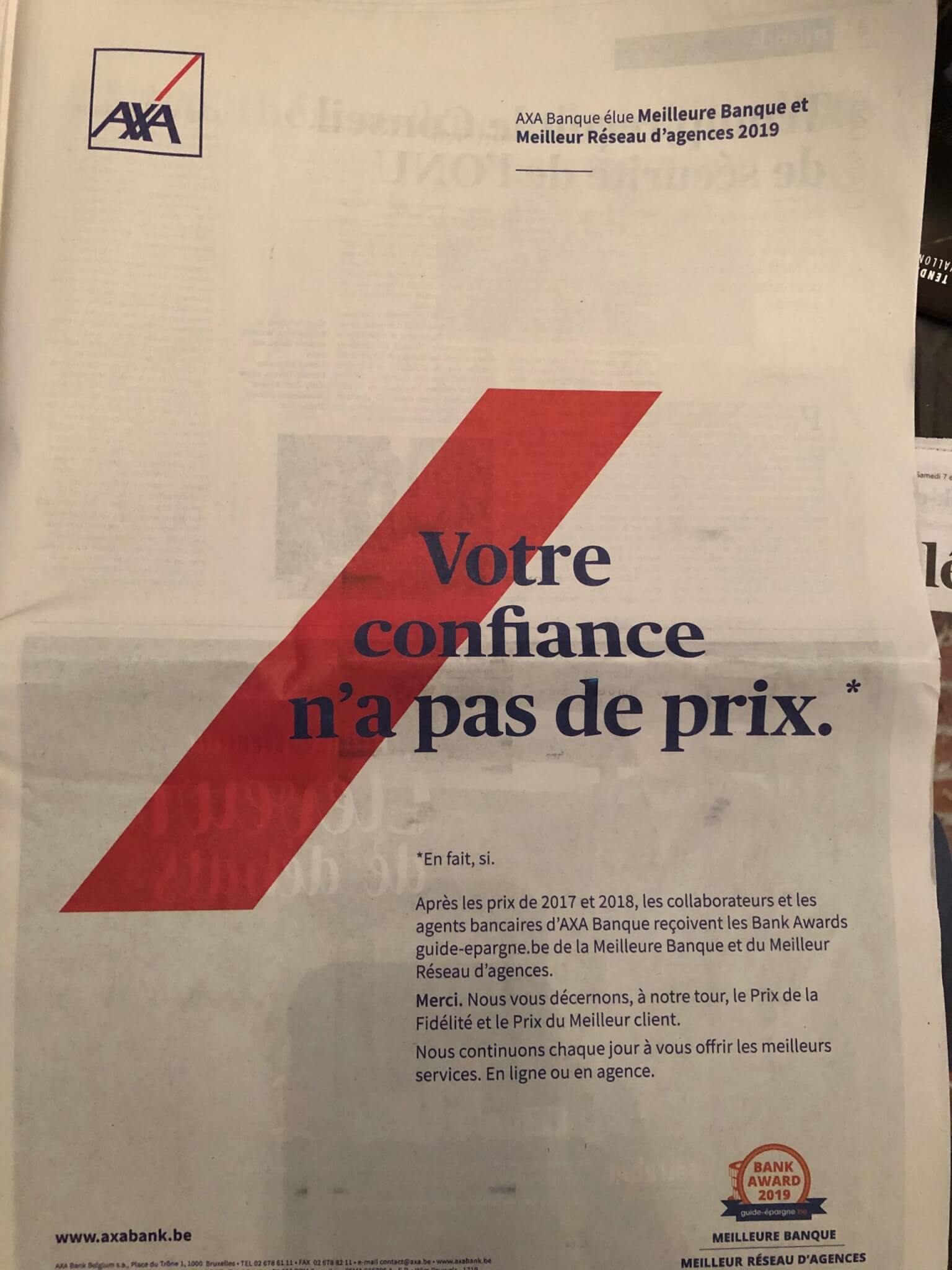 Un copy print pour la presse belge. Mon employeur a été élu meilleure banque et réseau d’agences 2019.