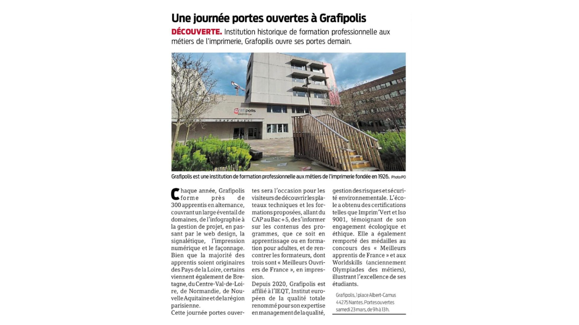 Située au cœur de l’île de Nantes, Grafipolis, institution historique de formation professionnelle aux métiers de l’imprimerie fondée en 1926 et établie au 1 place Albert Camus depuis 2010, vous accueille pour une journée portes ouvertes ce samedi 23 mars, de 9h à 13h.