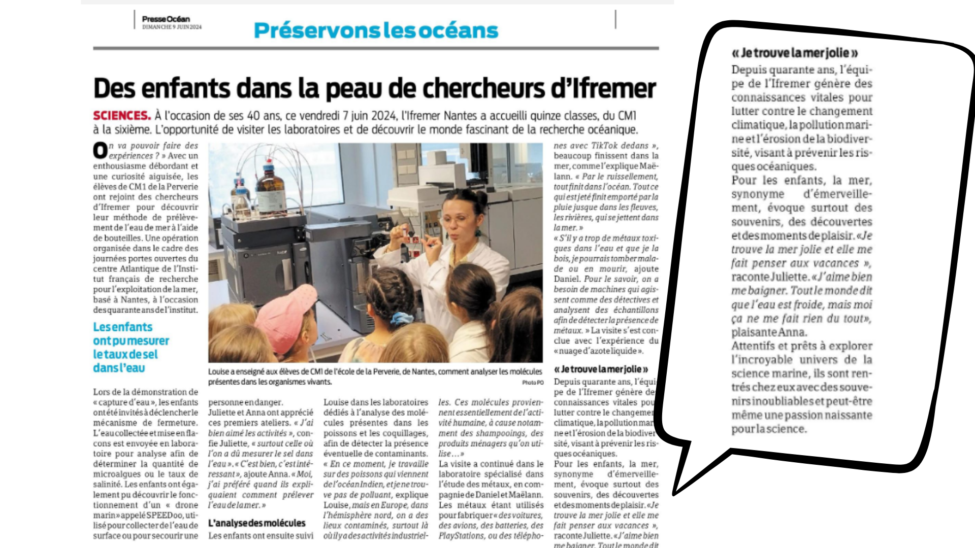 Depuis 40 ans, l’équipe de l’Ifremer génère des connaissances vitales pour lutter contre le changement climatique, la pollution marine et l’érosion de la biodiversité, visant à prévenir les risques océaniques. Pour les enfants, la mer, synonyme d’émerveillement, évoque surtout des souvenirs, des découvertes et des moments de plaisir. « Je trouve la mer jolie et elle me fait penser aux vacances. Mes grands-parents vivent à Perros-Guirec et mon frère fait du bateau à voile. » raconte Juliette. « J’aime bien me baigner. Tout le monde dit que l’eau est froide mais moi ça ne me fait rien du tout » plaisante Anna « Les poissons sont beaux et j’aime bien ramasser les petits crabes sur la plage. »