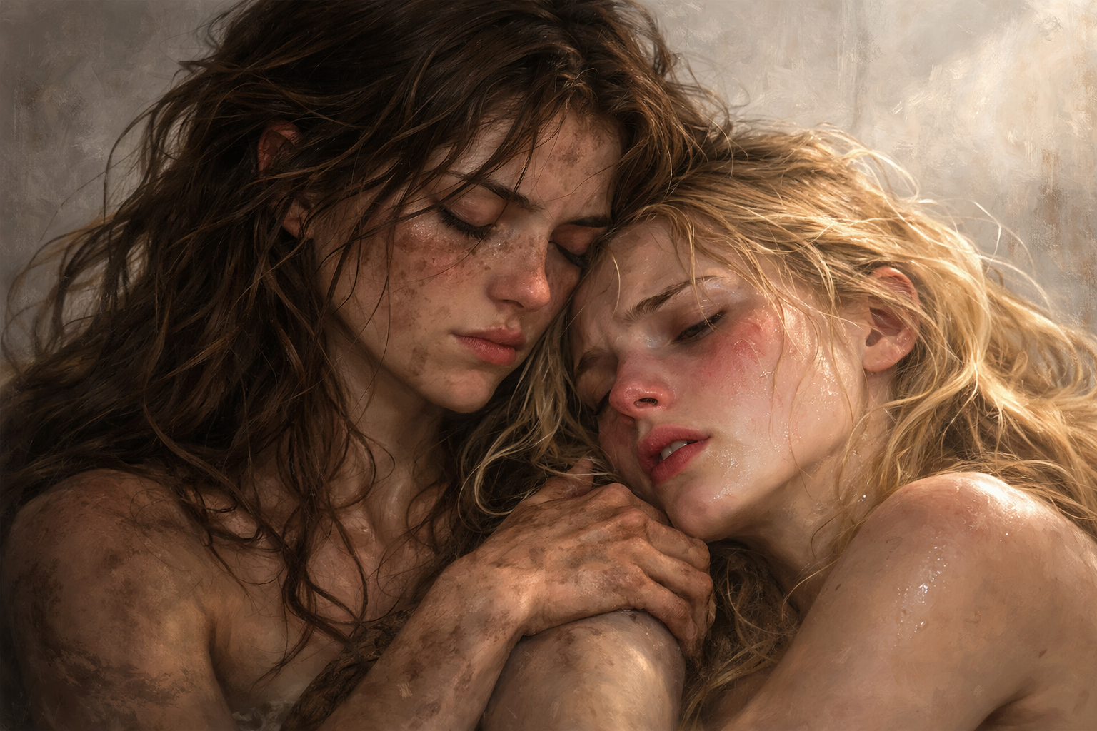 Avec douceur, Salini, simplement vêtue d’une modeste culotte grise, l’enveloppa tendrement dans ses bras, lui offrant son épaule pour épancher son chagrin. Eldria s’y abandonna aussitôt.