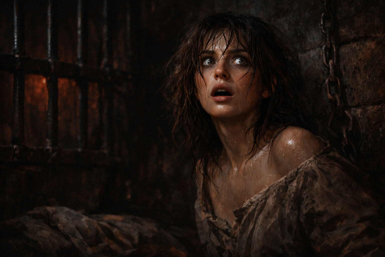 L’avant-dernière nuit précédant le jour fatidique, Eldria émergea d’un sommeil trouble et découvrit sa cellule baignée d’une étrange lueur bleutée. Au-dessus d’elle, se tenait le soldat blond. Debout, impassible, il ne portait pour tout vêtement que son heaume aux fentes étroites, derrière lesquelles ses pupilles sombres luisaient d’une lueur malsaine. Eldria était étendue à même le sol, nue, solidement enchaînée aux poignets et aux chevilles. Elle hurlait, mais aucun son ne franchissait ses lèvres.