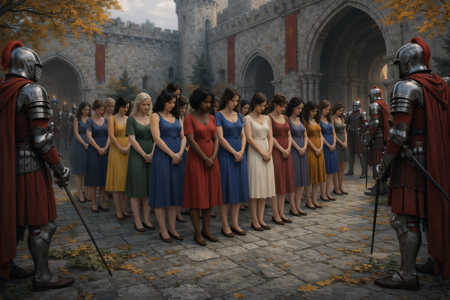 Ses deux prisonnières empoignées, l’imposant soldat casqué s’en alla cette fois-ci pour de bon vers la sortie. Avant de passer la porte qui l'emmenait peut-être vers une autre vie, Dricielle lança un dernier regard apeuré en direction de ses camarades restées ligotées dans la cour, impuissantes.