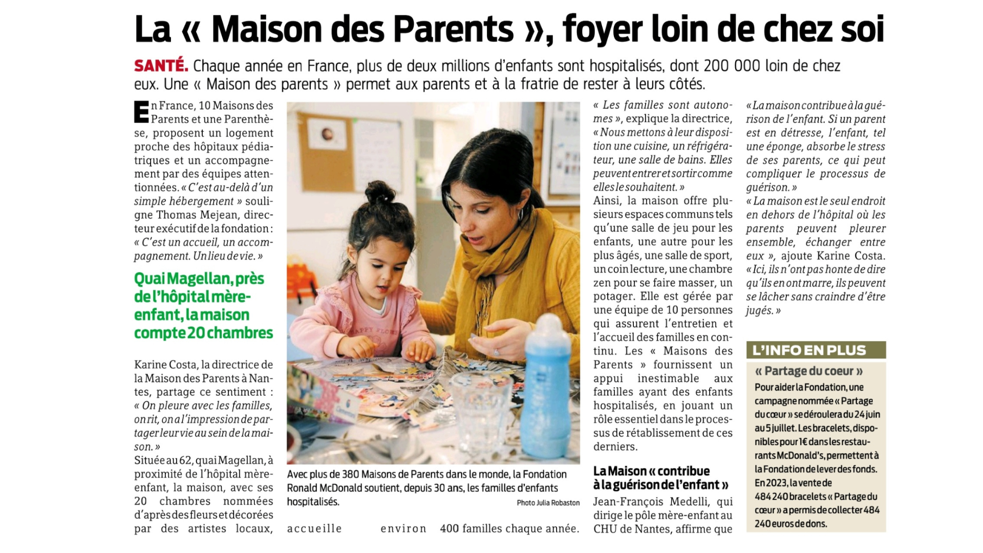 Pour aider la Fondation, une campagne nommée “Partage du cœur” se déroulera du 24 juin au 5 juillet. Les bracelets, disponibles pour 1€ dans les restaurants McDonald’s, permettent à la Fondation de lever des fonds. En 2023, la vente de 484 240 bracelets “Partage du cœur” a permis de collecter 484 240 euros de dons.