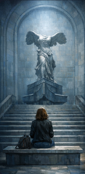 Ce matin‑là donc, Clarissa entra dans l'aile Denon encore vide. Une lumière bleutée s’étirait sur le marbre, froide et discrète, comme si l’endroit s'éveillait en douceur. Elle tourna la tête et la vit. Magistrale ! Indétrônable au-dessus des escaliers. Sa statue, dressée à l’avant, semblait attendre dans cet air figé.
