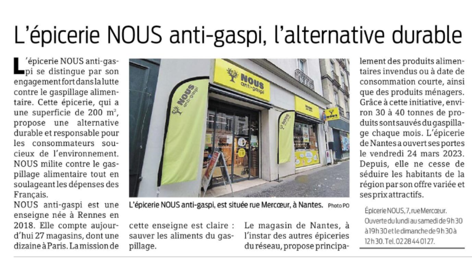 NOUS anti-gaspi est née à Rennes en 2018 et compte aujourd’hui 27 magasins, dont une dizaine à Paris. La mission de cette enseigne est claire : sauver les aliments du gaspillage. Le magasin de Nantes, à l’instar des autres épiceries du réseau, propose principalement des produits alimentaires invendus ou à date de consommation courte, ainsi que des produits ménagers. Grâce à cette initiative, environ 30 à 40 tonnes de produits sont