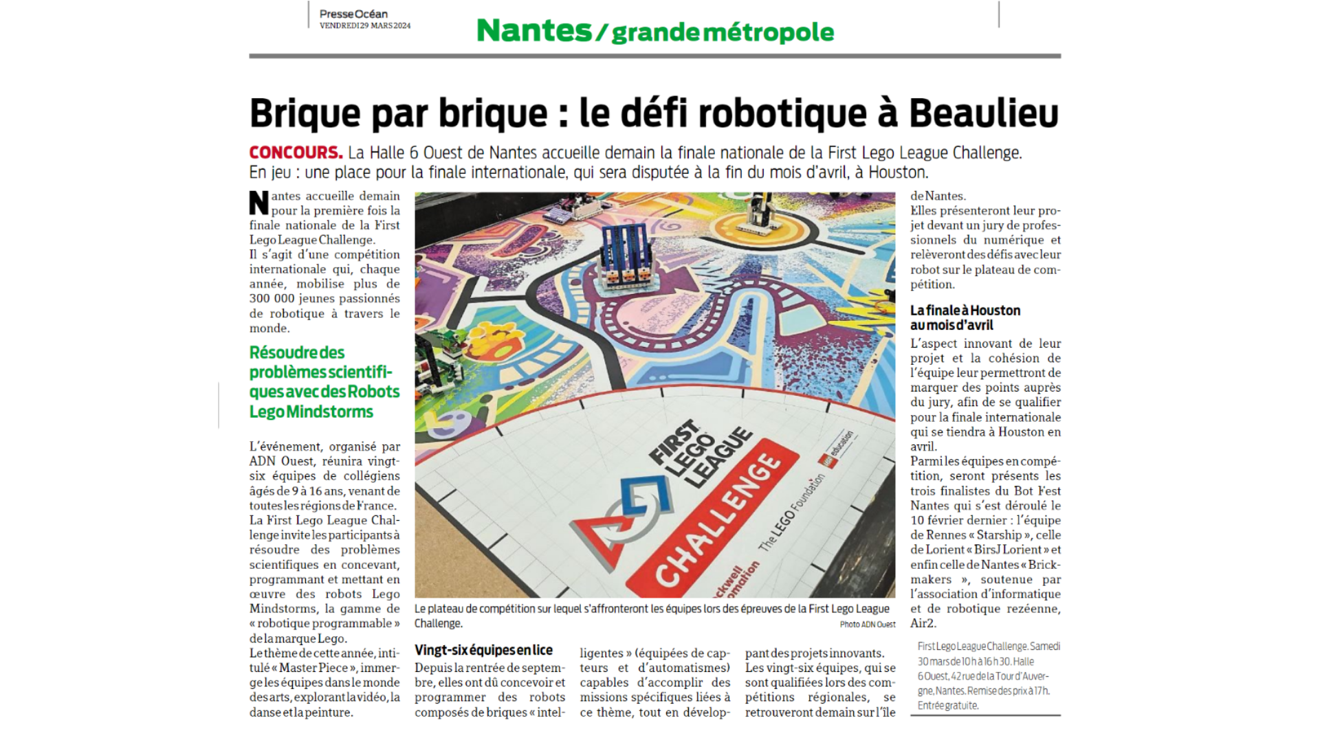 L’événement, organisé par ADN Ouest, réunira 26 équipes de collégiens âgés de 9 à 16 ans, venant de toutes les régions de France. La FIRST LEGO League Challenge invite les participants à résoudre des problèmes scientifiques en concevant, programmant et mettant en œuvre des robots LEGO Mindstorms, la gamme de ‘robotique programmable’ de la marque Lego.