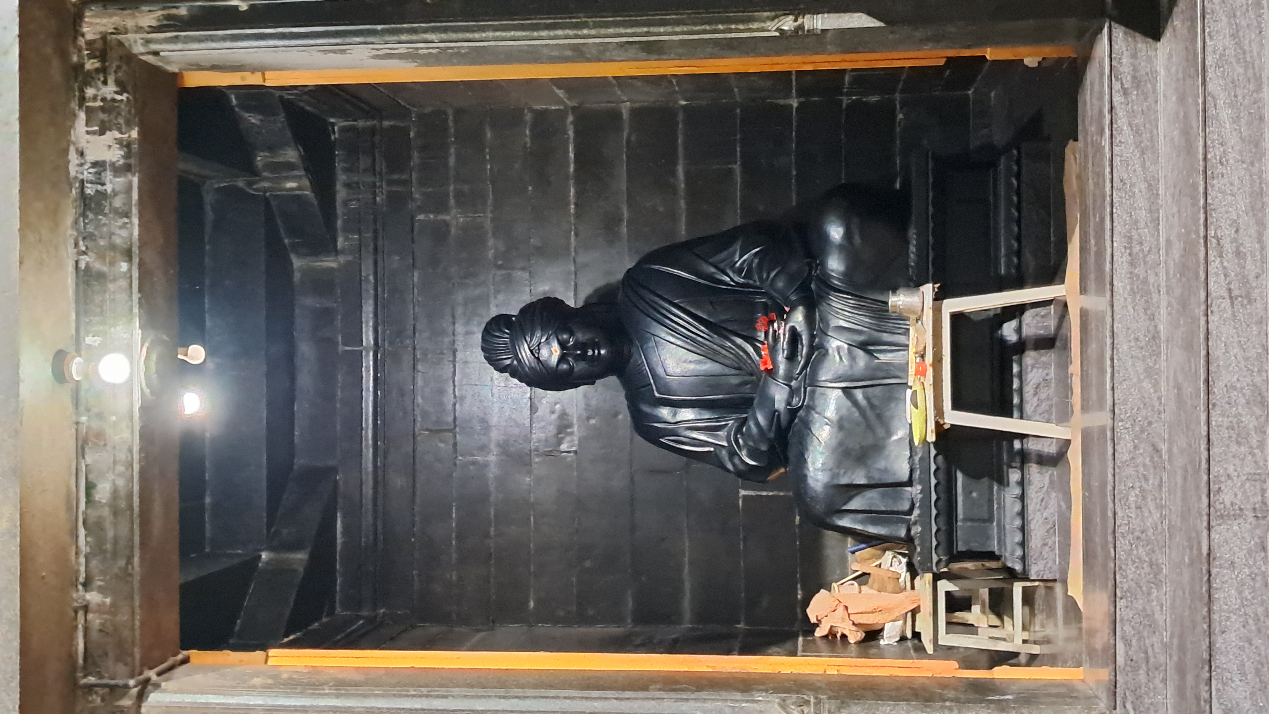 Il faut imaginer pénétrer ce lieu ancien composé d'imposants blocs de pierre taillés et sculptés, noirs, ne présentant aucune ouverture, totalement à l'abri du jour, éclairé uniquement par de nombreuses bougies à huile. Il faut se représenter franchir une succession de pièces, emboitée les unes dans les autres, pénétrant de plus en plus au cœur du temple, tel Indiana Jones, pour parvenir à trouver, au fond d'une petite loge exigüe, tel un trésor extrêmement bien protégé, la fameuse statue de la déesse, pas même un mètre de hauteur, parée de tissus et d'offrandes, devant laquelle des milliers d'indiens viennent chaque jour se prosterner et invoquer la protection.