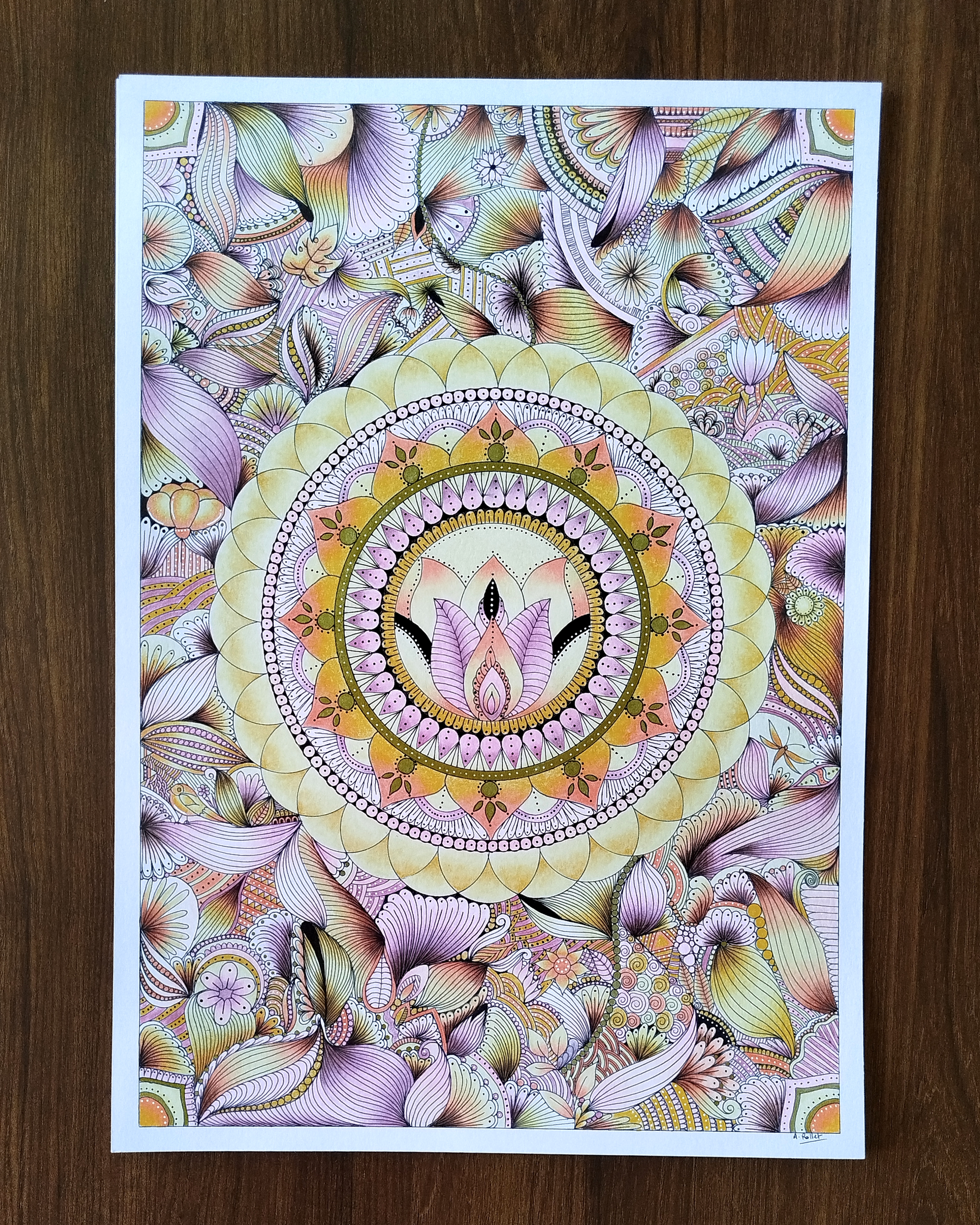 Matériel: Feutre fin noir, stylo gel blanc, crayons de couleurs