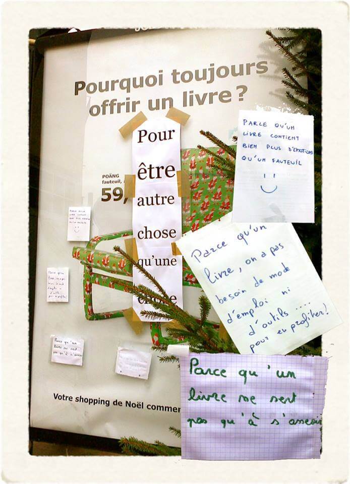 On l’a compris, la grande enseigne suédoise a voulu que nous préférions l’achat d’un meuble plutôt qu’un livre, à offrir en cadeau. Ont-ils prévu le détournement du message et la contre-publicité sur leurs propres supports ? Je ne le pense pas.