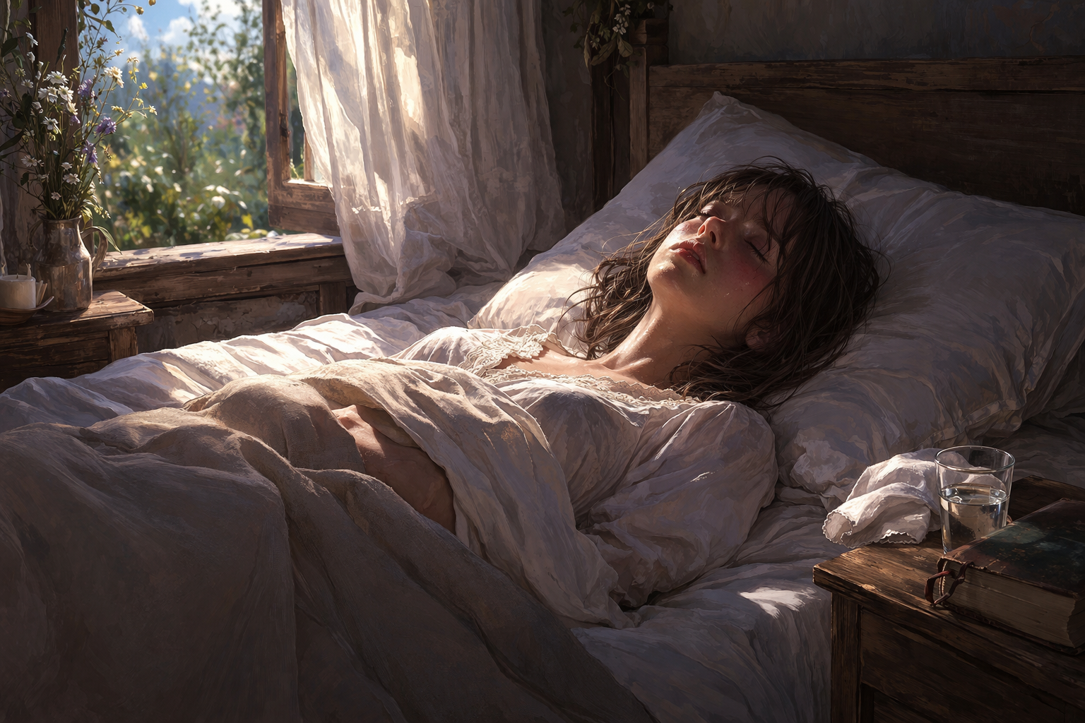 Derrière la porte, les pas se rapprochaient dangereusement. Dans cinq secondes, peut-être moins, quelqu’un pourrait surgir. Pas le temps de se cacher sous le lit, encore moins de se rhabiller. Elle fit alors la seule chose qui lui sembla possible : se glisser en hâte sous son fin drap d’été, priant de toute son âme pour que l’étoffe légère suffise à la dissimuler de façon convaincante.