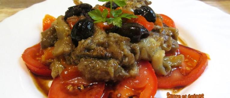 Voici une salade bien fraîche et savoureuse, pour profiter des bons légumes d'été. C'est un mélange de légumes cuits (aubergines, poivrons) et crus (tomates), le tout bien parfumé au citron et vinaigre balsamique et accommodé avec des olives. Une salade estivale qui nous a bien régalés.