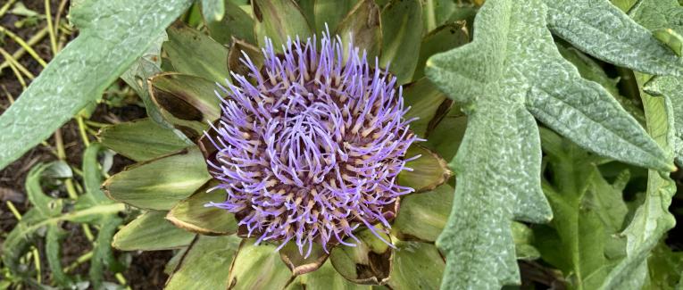 Et voici la fameuse fleur de l’artichaut. Vous remarquerez qu’on dirait une très grosse fleur de chardon, un parent bien sûr. Par contre l’artichaut que j’avais trempé dans un pot d’eau se dessèche de jour en jour. Il ne fera pas sa fleur.