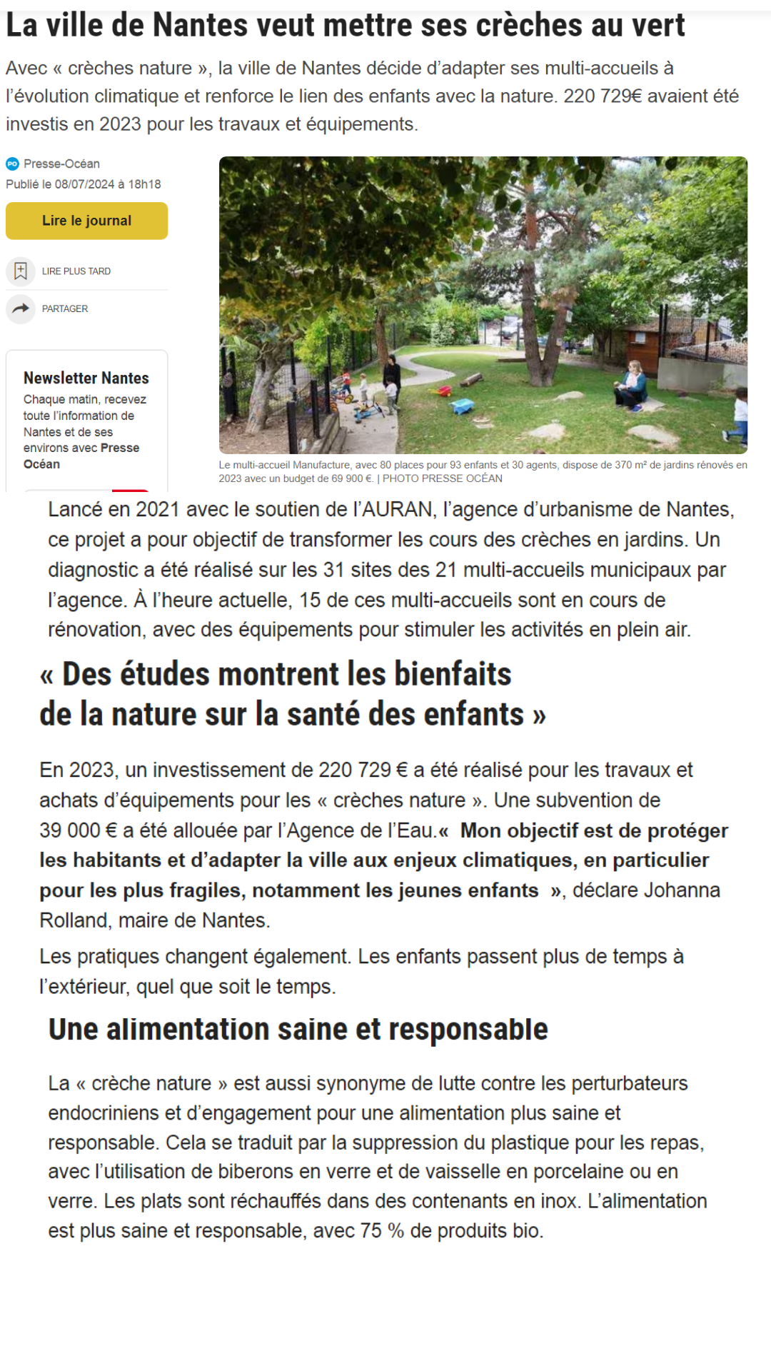 Lancé en 2021 avec le soutien de l’AURAN, l’agence d’urbanisme de Nantes, ce projet a pour objectif de transformer les cours des crèches en jardins. Un diagnostic a été réalisé sur les 31 sites des 21 multi-accueils municipaux par l’agence. À l’heure actuelle, 15 de ces multi-accueils sont en cours de rénovation, avec équipements pour stimuler les activités en plein air.
