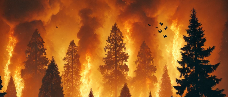 Devant l'incendie d'une foret, des animaux fuient.