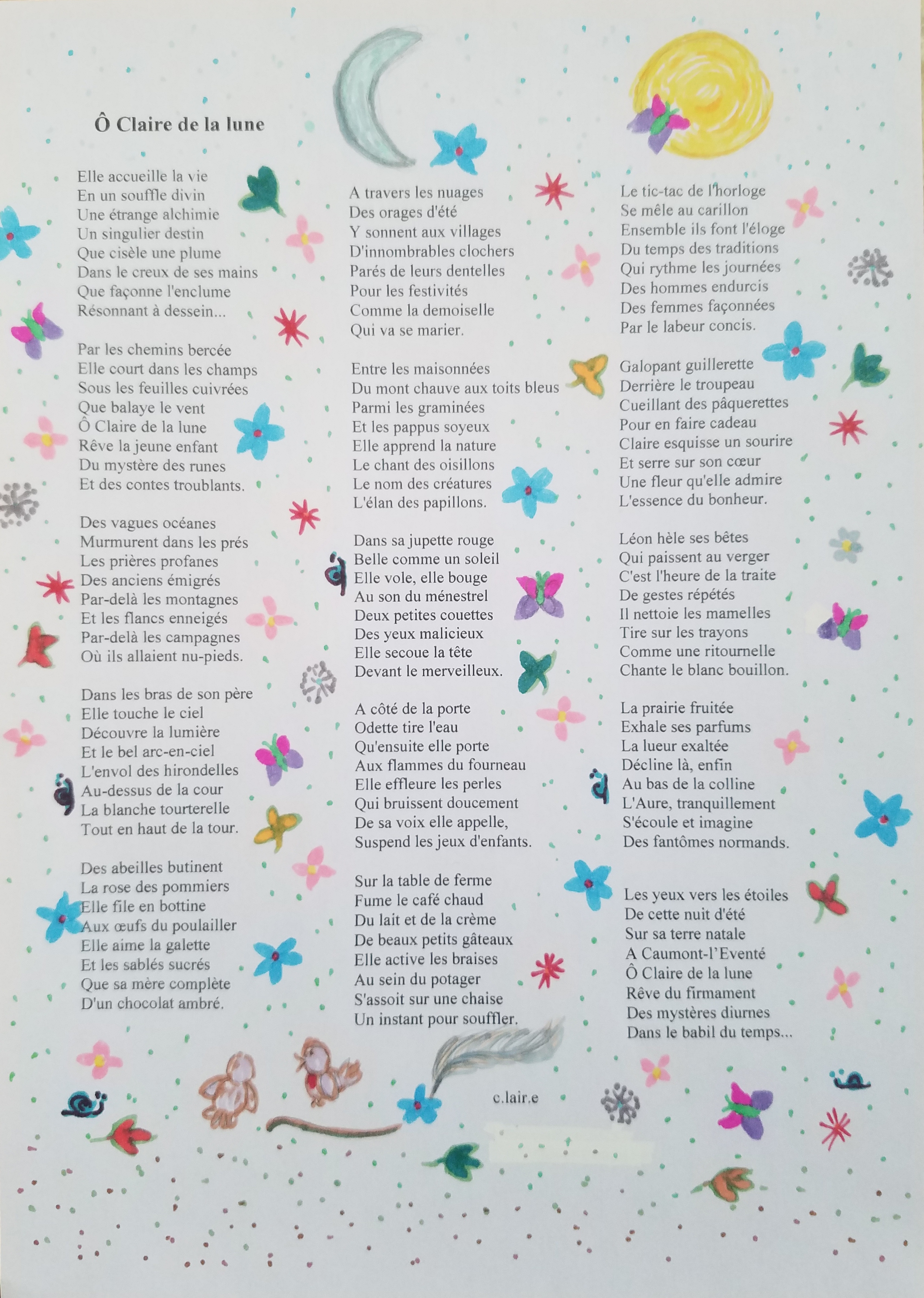 des escargots, des oiseaux, une plume, la lune et le soleil.