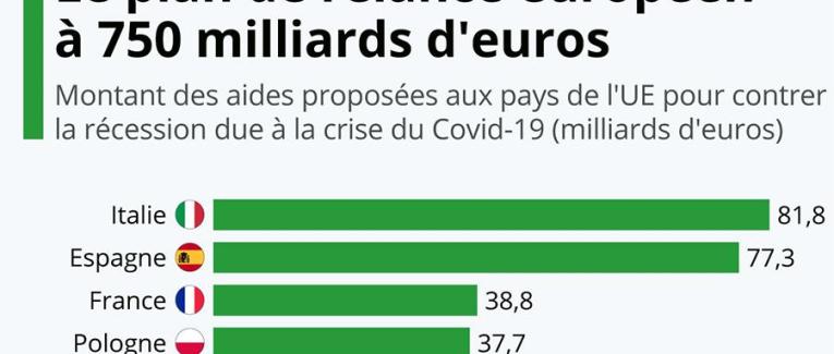 Sur les 750 milliards d’euros mobilisés au niveau européen, dont 390 milliards d’euros de subventions alloués aux Etats les plus frappés par la pandémie, la France va elle disposer de 40 milliards d’euros de subventions. Selon le gouvernement, l’économie française devrait se contracter de 11% cette année, du fait de la crise engendrée par l’épidémie, avant de rebondir de 8% en 2021, et il anticipe une hausse de 800.000 chômeurs cette année. Jean Castex a annoncé la mobilisation d’un plan de relance de 100 milliards d’euros sur deux ans pour redresser l’économie française. Le contenu précis sera dévoilé à la fin de l’été, mais il consacrera notamment 40 milliards d’euros à l’industrie et à la compétitivité des entreprises et 20 milliards à la transition écologique.