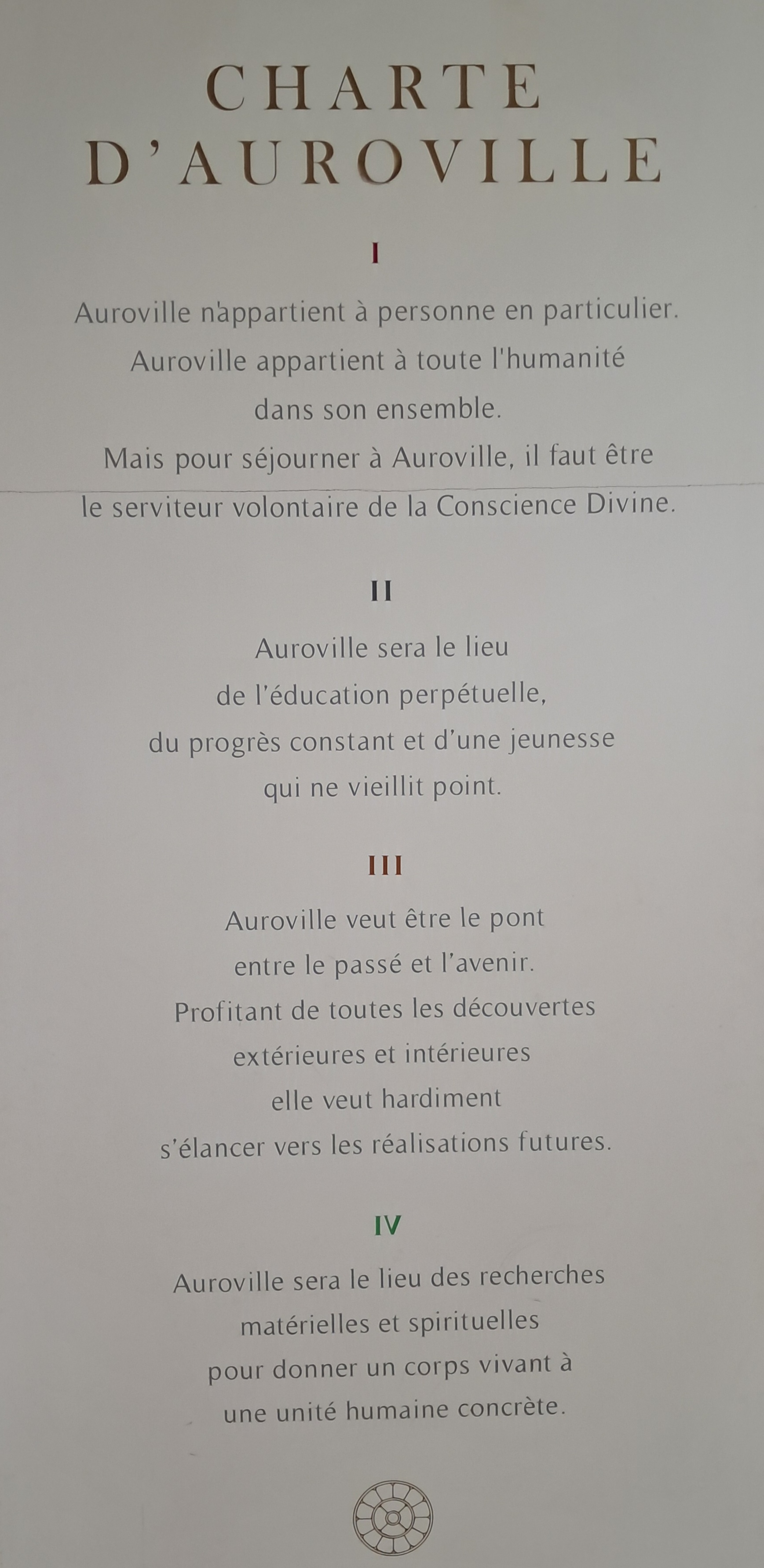 - Auroville se veut un pont entre le passé et l'avenir. Tirant parti de toutes les découvertes, tant extérieures qu'intérieures, Auroville s'avancera avec audace vers les réalisations futures.