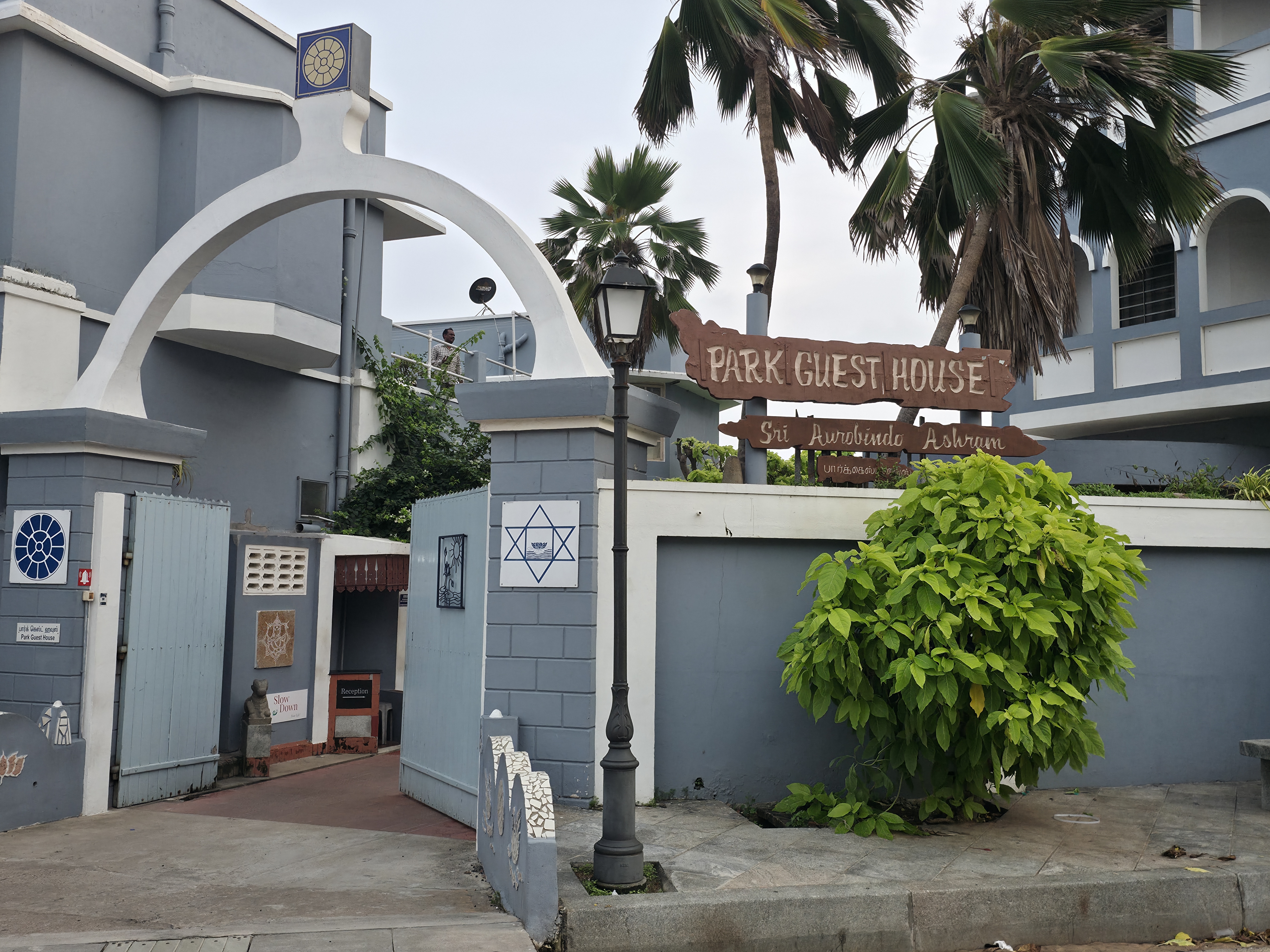 On y trouve aussi l'ashram de Sri Aurobindo dont il va falloir que je vous parle, qui regroupe 2 à 3000 résidents permanents ou temporaires, qui possède de nombreuses structures en ville bien reconnaissables par leurs murs peints de gris et de blanc, ce qui interpelle vraiment sur la puissance financière de cette communauté spirituelle aux ramifications internationales.