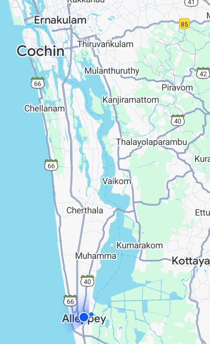 Elle se situe à l'entrée des Backwaters, un ensemble d'étendues d'eau se situant en retrait des côtes, confluence de nombreuses rivières dessinant de multiples lagunes et marais, reliés entre eux par une multitude de canaux, formant ainsi un immense complexe de voies navigables sur plusieurs centaines de kilomètres. C'est cet ensemble qui a permis pendant plusieurs siècles la culture et l'acheminement de nombreux produits comme le poivre, la cannelle, la coco, le coton, la soie, les perles, ou l'ivoire... et c'est cet ensemble qui fait la renommée touristique du Kerala aujourd'hui.