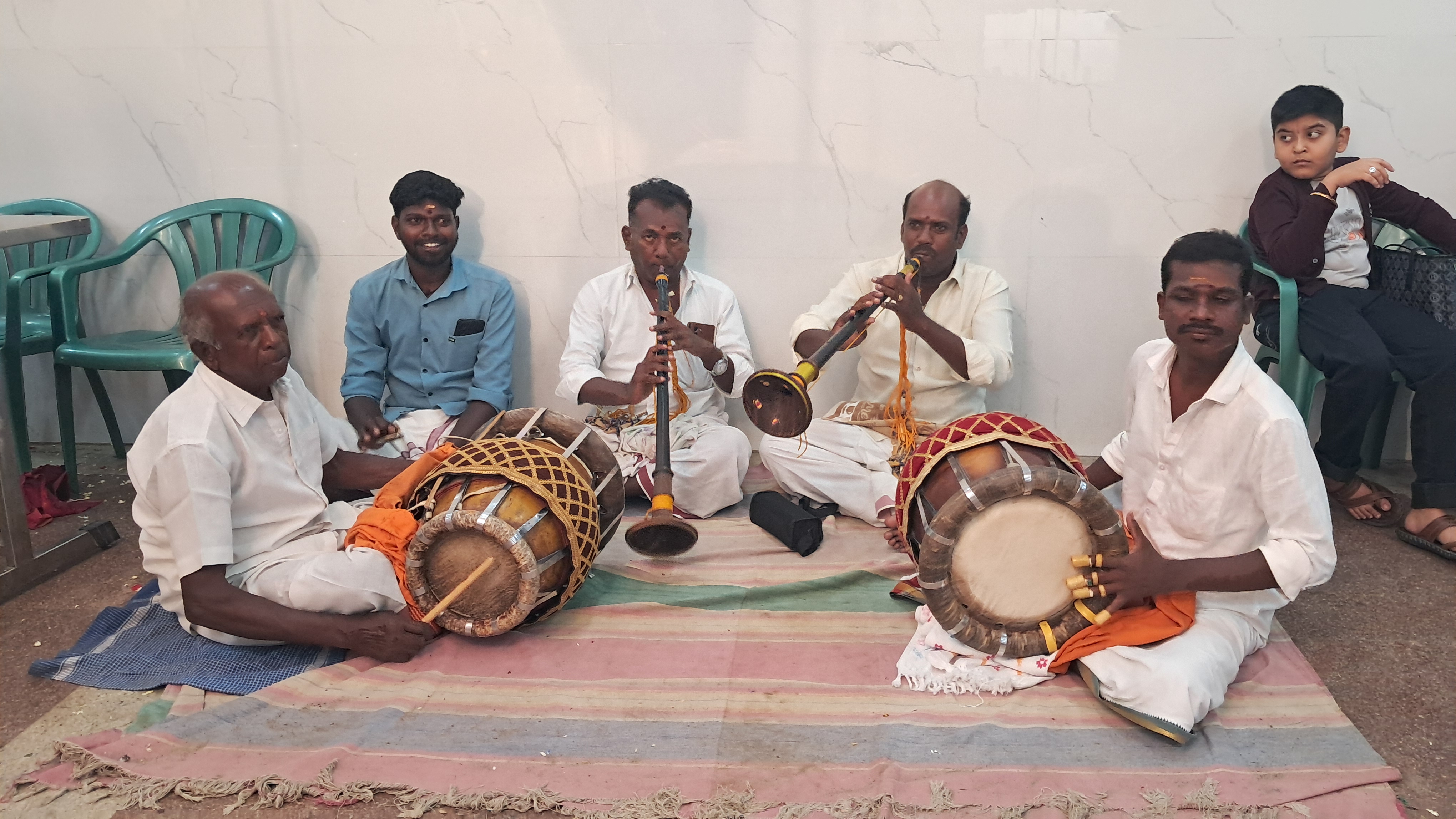 Le marié, vêtu d'un seul dhoti jaune ( une pièce de tissu de 2m nouée autour de la taille, le « pantalon » des indiens du sud) et ses parents sont ainsi guidés par le prêtre durant toute la cérémonie afin d'exécuter un long et très complexe rituel, que je ne saurais vous expliquer en détail, qui dure environ 2h. Des musiciens accompagnent le prêtre durant tout le déroulé de la cérémonie, alors qu'il récite au micro des invocations sacrées.
