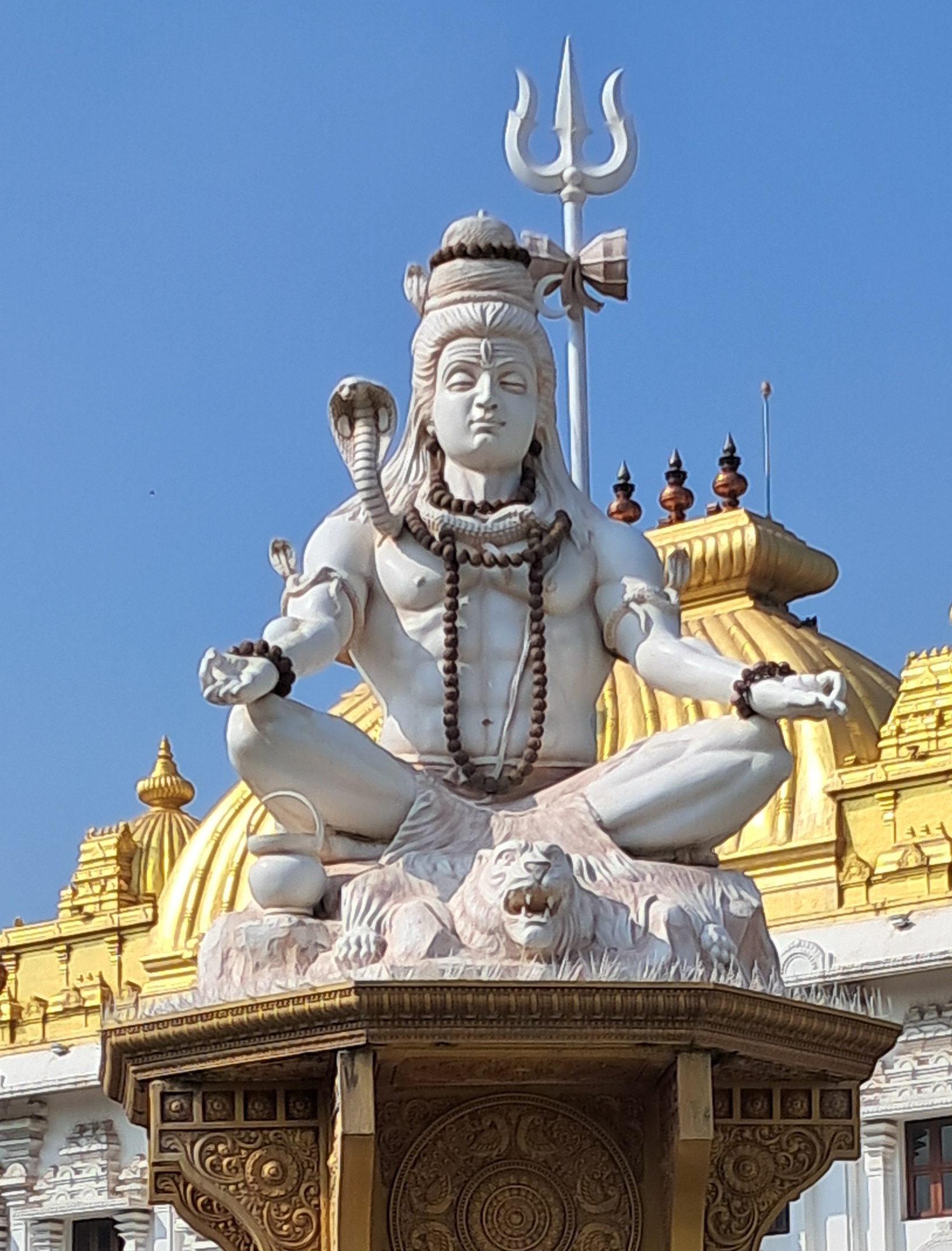 - et une force destructrice incarnée par Shiva. Il est représenté avec les cheveux longs, un 3ème œil et un croissant de lune à ses côtés, vêtu d'un pagne avec des cobras autour du cou, et muni d'un trident qu'accompagne un petit tambour, souvent assis en position méditative sur une peau de tigre. Il représente la Conscience Absolue, le destructeur des Illusions.