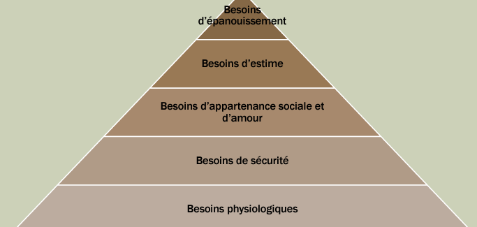 Tout au long de notre vie, nous cherchons à subvenir à nos besoins afin de vivre en harmonie avec nous-mêmes et notre environnement. Ces différents besoins ont été définis et catégorisés par le psychologue américain Abraham Maslow en 1943. Il utilise une forme pyramidale pour souligner la hiérarchie entre chaque catégorie de besoin :