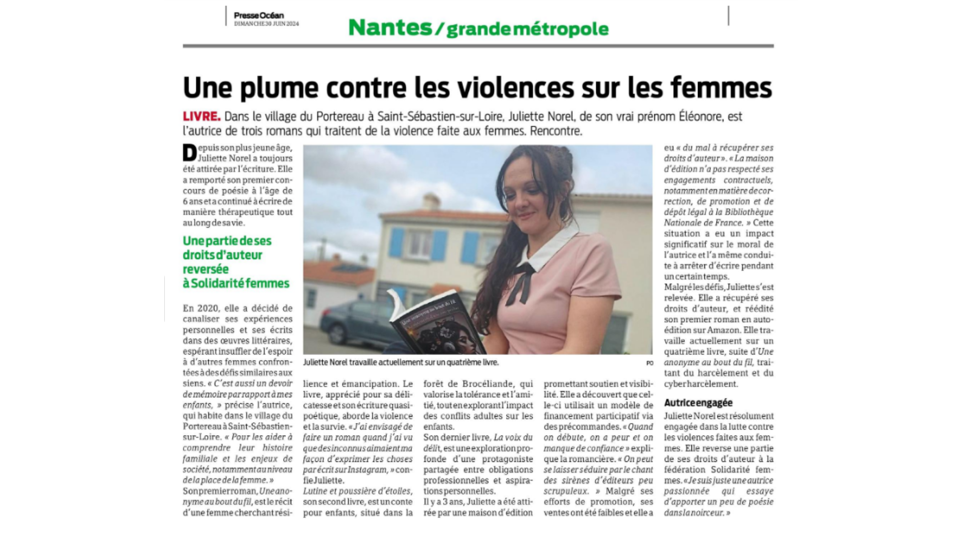 Dans le village du Portereau à Saint-Sébastien-sur-Loire, une écrivaine se distingue par son talent et sa sensibilité : Juliette Norel. Née à Clermont-Ferrand et résidant à Saint-Sébastien depuis près d’une décennie, Juliette, de son vrai nom Éléonore, est une mère dévouée et une autrice passionnée.