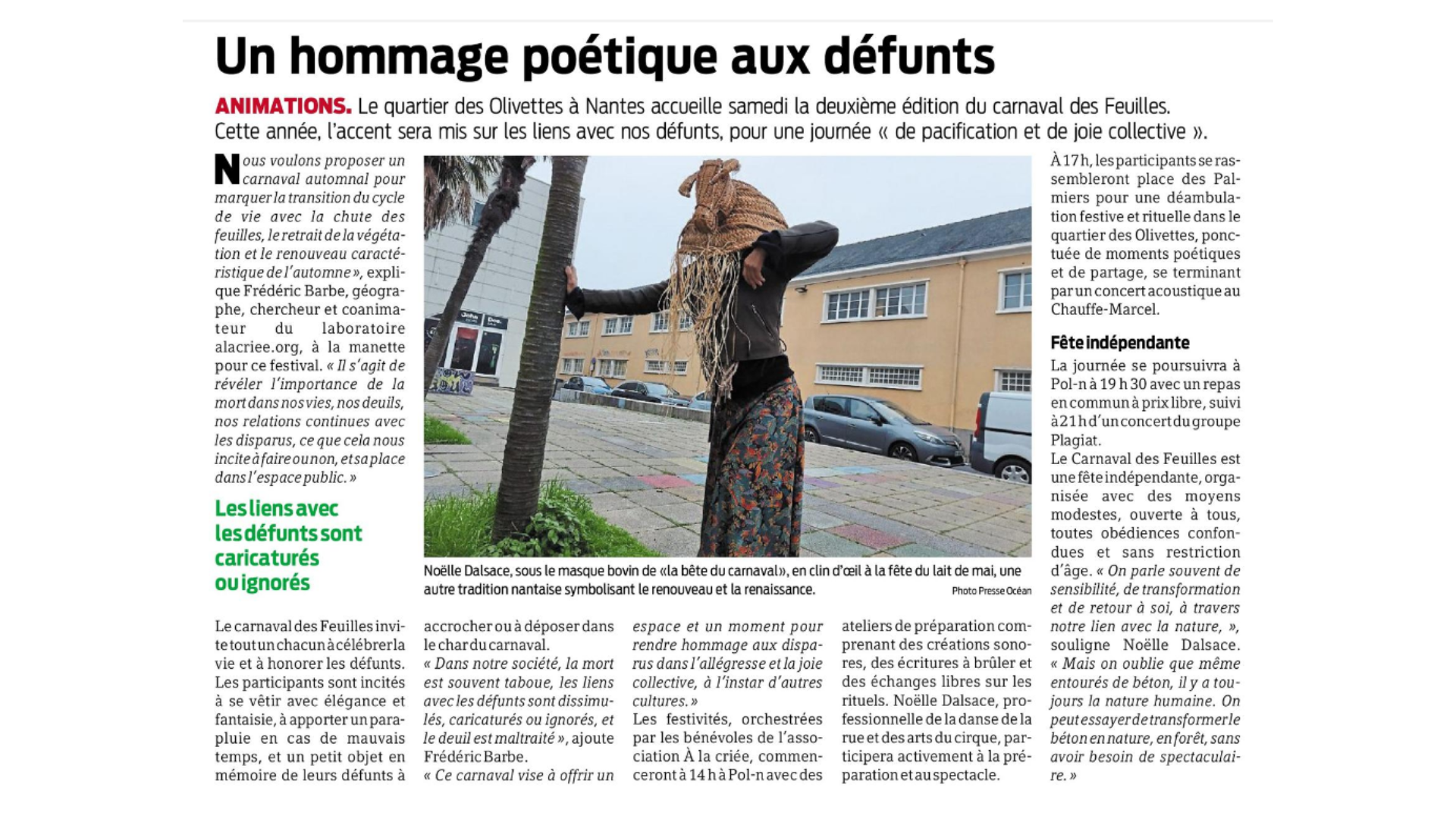 Samedi 2 novembre, jour de la Fête des Morts, le quartier des Olivettes à Nantes accueillera la deuxième édition du Carnaval des Feuilles. Cette année, l'accent sera mis sur la reliaison avec nos défunts, pour une journée de pacification et de joie collective.