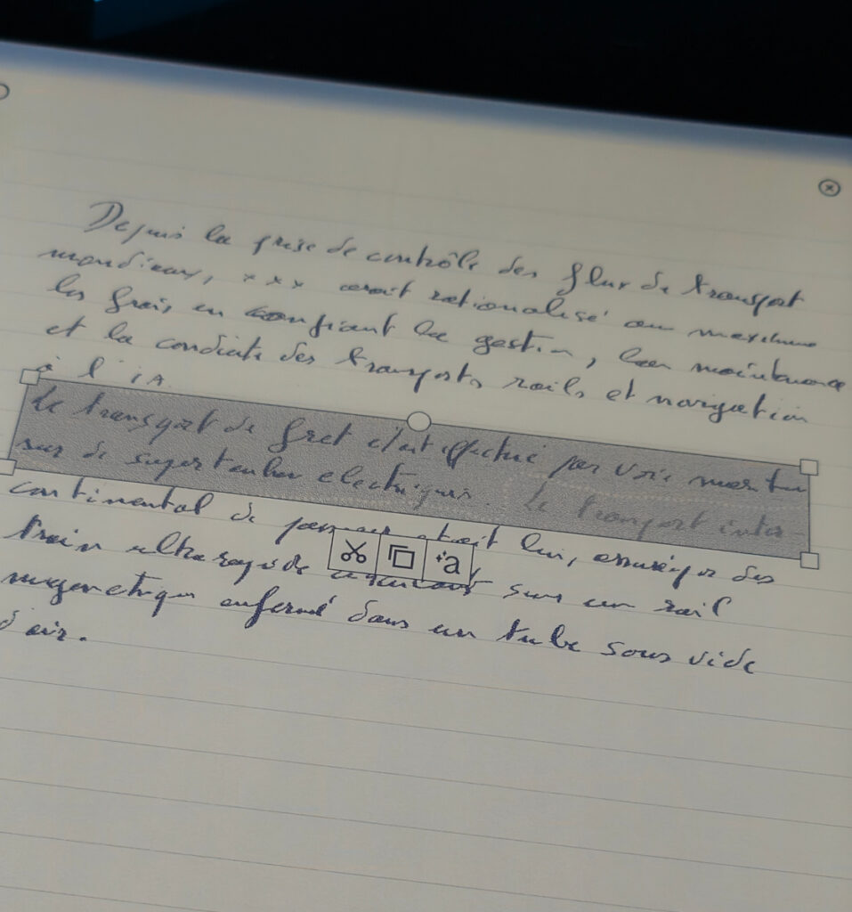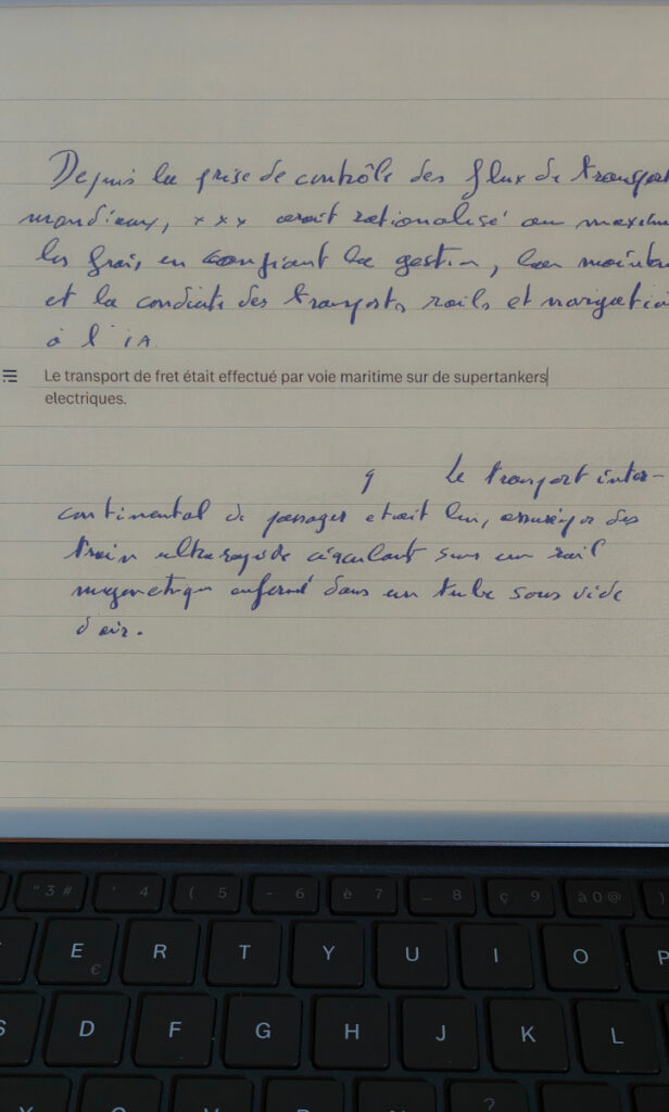 Bien sûr, elle est plus imposante en poids et par ses dimensions, ce qui ne la rend pas commode pour un rôle unique de lecture. Toutefois, la prise de notes est si intuitive, j’ai l’impression d’écrire sur une feuille de papier. Munie d’un clavier, elle me permet aussi, à ma convenance, la dactylographie sans la nécessité d’employer le stylet. L’encre électronique est colorée et me permet de souligner et d’annoter mon premier jet sans effort.