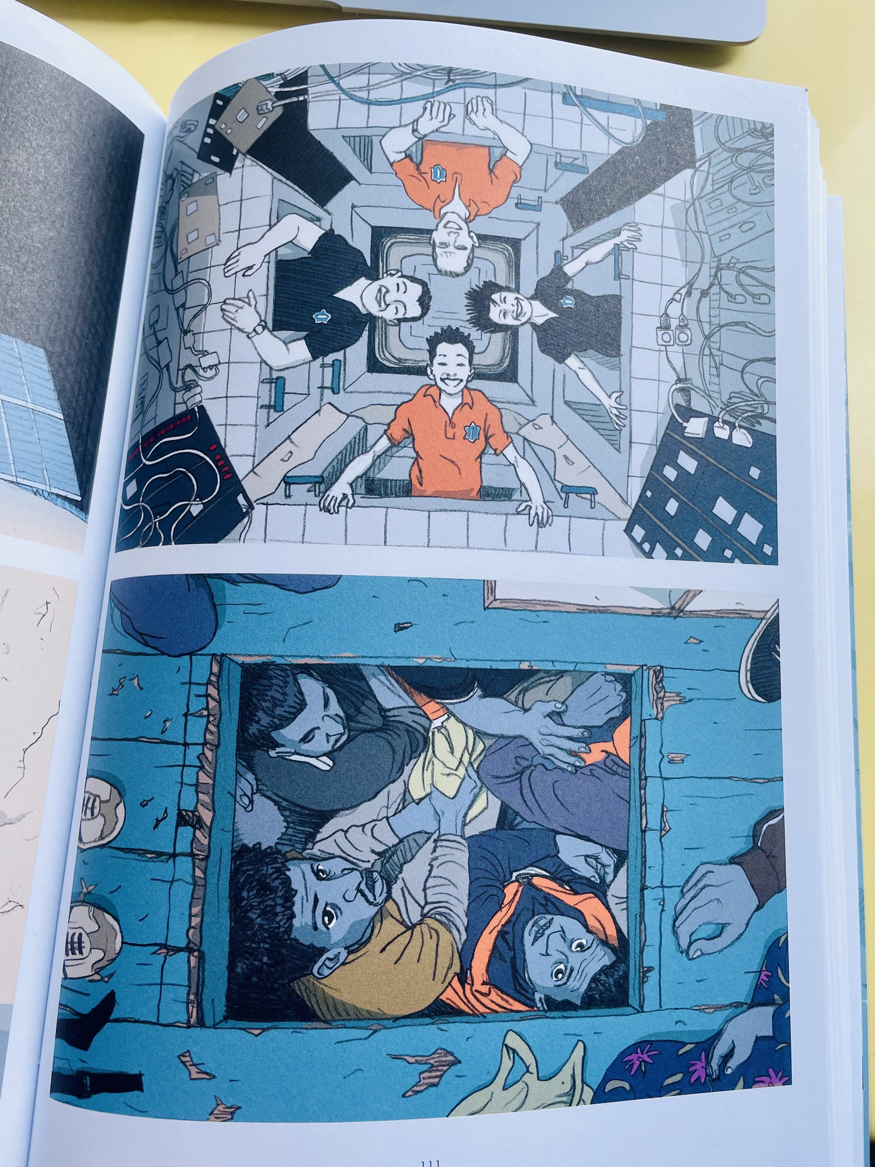 Un.e enfant pourrait décrypter la plupart des images. Même si bien sûr, aucun.e adulte n’aurait idée de lui laisser feuilleter des illustrations aussi anxiogènes. Hypocrisie ou « refoulement », comme le nomme l’auteur ? C’est pourtant bien le monde dans lequel nous acceptons de laisser grandir nos enfants… C’est pourtant bien le monde dans lequel nous acceptons de laisser mourir sous nos yeux les populations les plus pauvres touchées par la crise climatique. Ces personn(ag)es, ces exilé.e.s notamment dont les regards semblent chercher les nôtres.