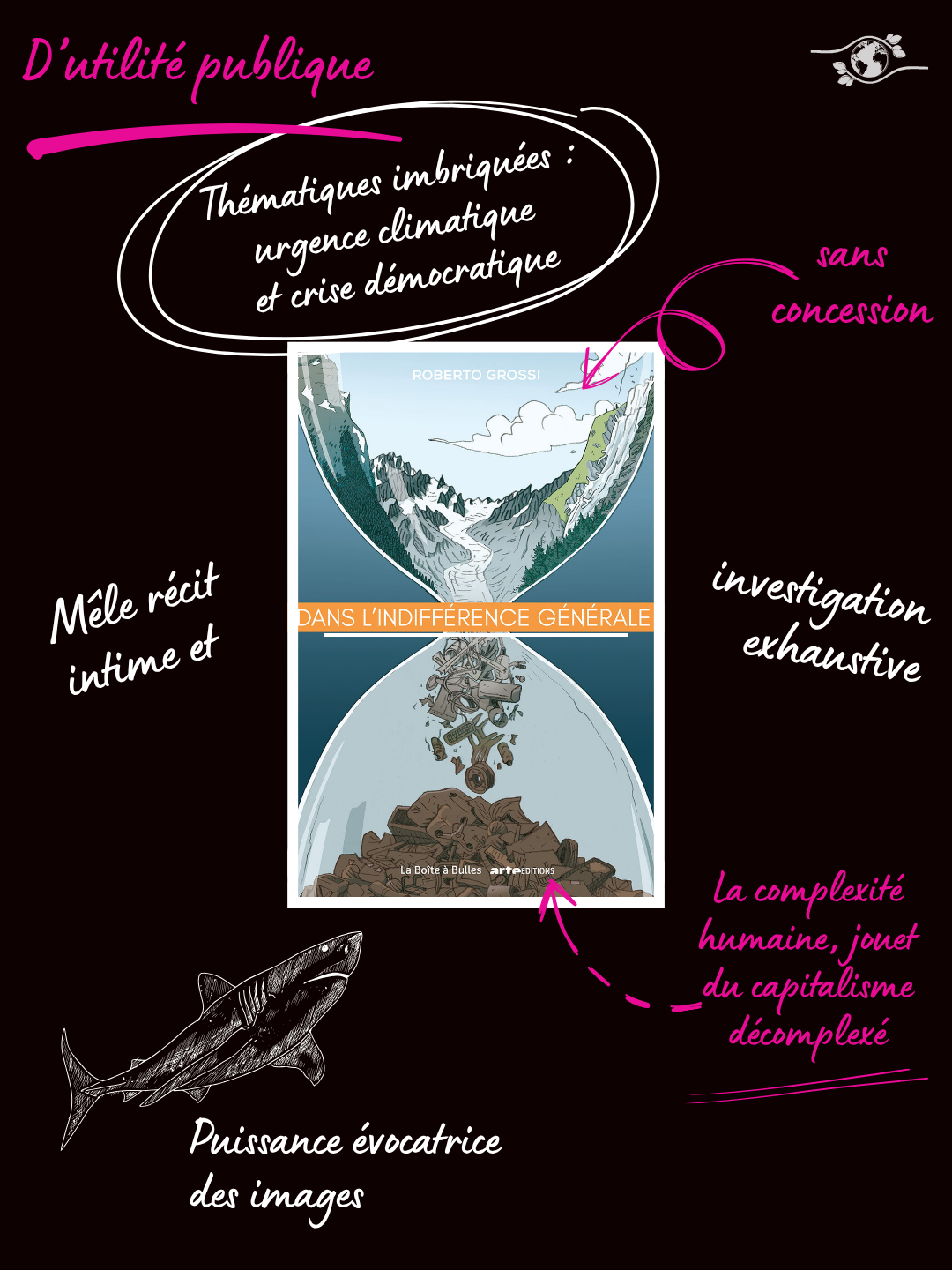 Si Roberto Grossi évoque la complexité de la psyché des êtres si facilement malléable en suscitant chez eux des désirs irréalisables et leur désespérante mémoire à court terme, c’est sans accabler l’humanité-même mais bien le capitalisme, la caste des ultra-riches et leur activité délétère.