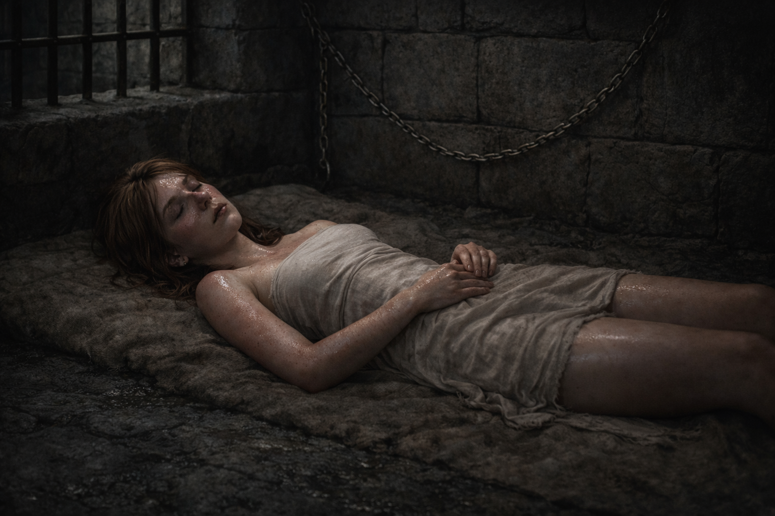Eldria se réveilla subitement. Il régnait une obscurité presque absolue dans la petite cellule qu'elle partageait avec Dricielle pour leur première nuit en captivité. Le silence était en revanche complet, presque écrasant. Elle se redressa tant bien que mal et se massa le dos. Le sol de terre battue, que la fine paillasse sur laquelle elle dormait peinait à amortir, la faisait souffrir. Par miracle, elle avait pourtant réussi à trouver le sommeil quelques heures plus tôt, tombant littéralement d’épuisement après les épreuves insupportables d’une journée interminable.