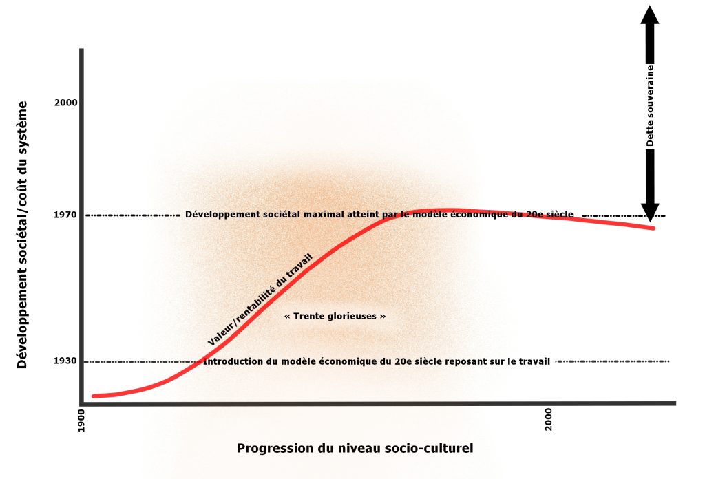 L’origine de la dette souveraine est que si au moment de l’introduction du modèle économique du 20e siècle reposant sur le travail il avait encore une valeur, parce que la technologie ne permettant de surseoir à la force de travail humaine, une fois l’acmé du développement sociétal possible atteint par ce modèle limité par la force humaine, la valeur du travail, et donc sa rentabilité a commencé à baisser en proportion du niveau socio-culturel et du coût d’un système aussi développé. Le travail humain ne pouvant être rentable que par la productivité, par essence limitée aux capacités humaines, il ne peut plus générer suffisamment de valeur ajoutée pour assumer les charges du système. Au fil du temps les aides aux entreprises pour leur apporter un semblant de rentabilité et maintenir les investissements et par conséquent les emplois qui en dépendent ont augmenté d’année en année et représentent aujourd’hui 170 milliards, chaque année, ce qui est la vraie source du déficit budgétaire.