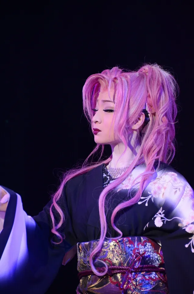 La collision tradition-contemporain — L'image est un choc visuel délibéré. Le kimono noir à motifs floraux de cerisier et le somptueux obi brocard or et rouge ancrent la figure dans la tradition du buyō shō. Mais la perruque rose-violet aux boucles cascadantes, coiffée en queue haute à la manière d'un personnage d'anime ou de visual kei, propulse l'ensemble dans une esthétique résolument contemporaine. C'est exactement ce que Kurata appelle le « variété hybride » (zasshusei) : le taishū engeki actuel fait coexister sur scène des éléments de l'époque d'Edo et de la J-Pop.