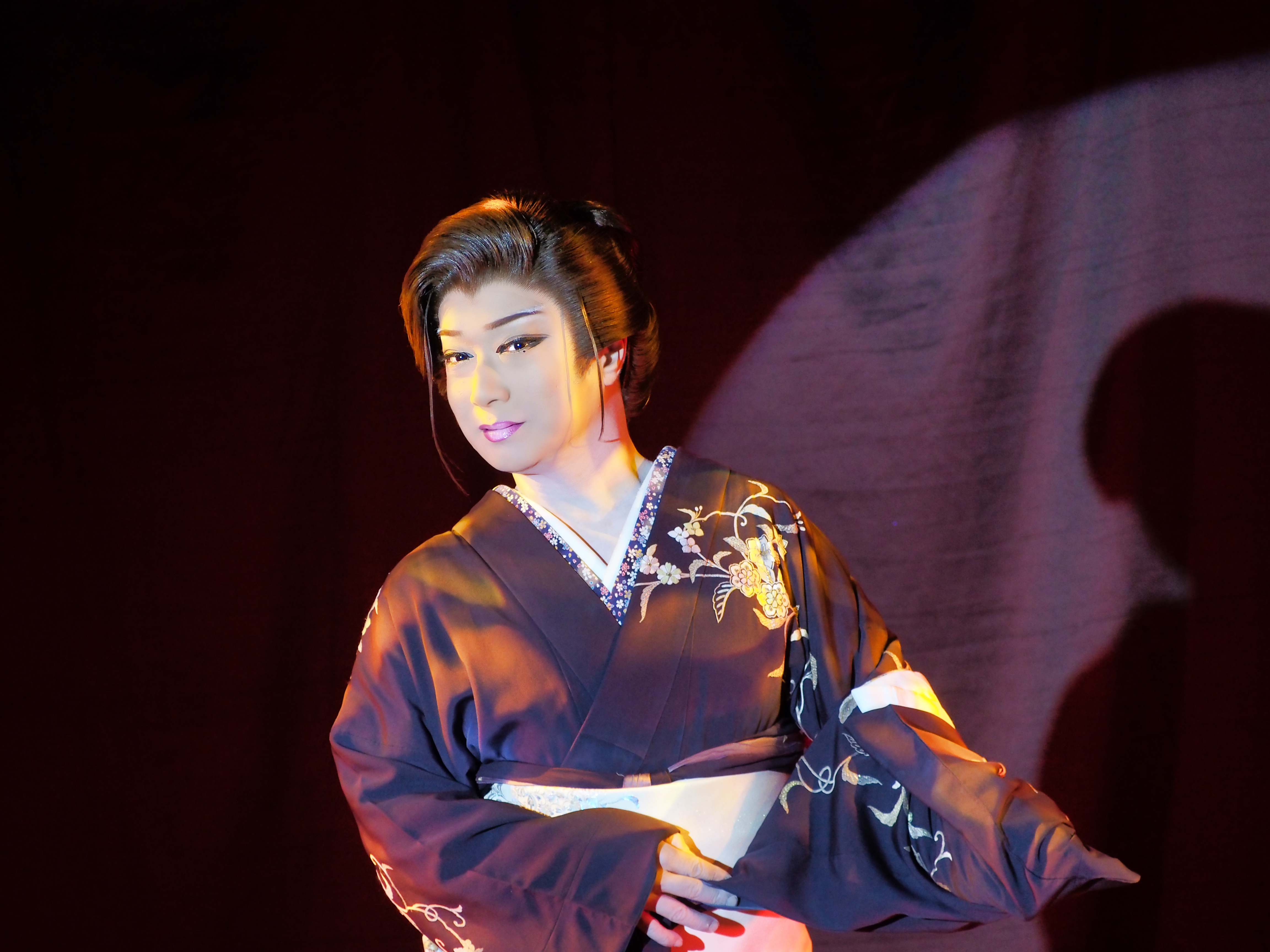 À travers vos trois photos, on obtient une trilogie remarquable de l'onnagata dans le taishū engeki : le flamboyant populaire (kimono rose, photo 1), le classique épuré (kimono sombre, photo 2), et l'hybride contemporain (cette photo). Ensemble, elles illustrent toute l'amplitude d'un genre qui, comme le montrent les deux articles, tire sa vitalité de sa capacité à se réinventer sans cesse tout en restant enraciné dans une transmission corporelle séculaire.