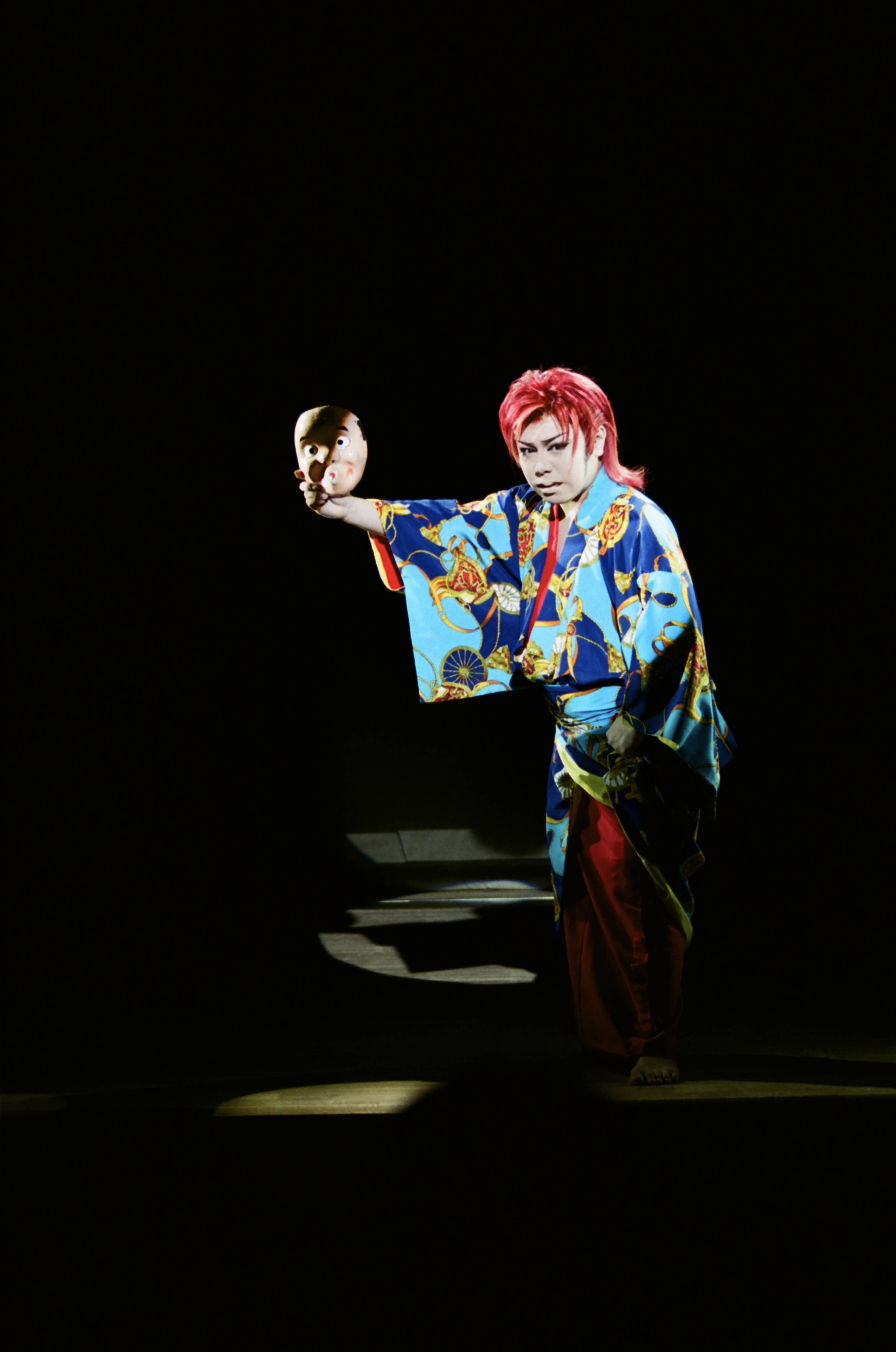 Le profil et les yeux fermés — L'acteur est saisi de profil, paupières closes, dans un moment d'intériorité au milieu de la danse. Ce contraste entre l'extravagance visuelle et le recueillement du geste illustre parfaitement la tension productive entre spectacle et art que Koikawa Junya formulait par sa métaphore du restaurant familial aspirant à la qualité du restaurant gastronomique.