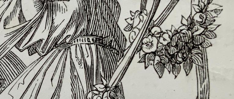 Le lendemain dans son grenier Mathilde chuchota sa demande une seconde fois au fruit minuscule et ridé. Une robe apparut, toute différente, mais aussi remarquable. Du voile rouge grenat et des perles de pluie, du taffetas fripé et des boutons vernis, un peu de velours noir et des plumes de pie, de paon, de geai, d’oiseau de paradis, je ne saurais tout dire… Elle fit son effet et c’est peu dire. Le chevalier lui offrit une bague, étrangement assortie à la robe et au doigt ! Encore une fois c’était du sur-mesure ! Ils dansèrent à nouveau, les bouches se taisaient, les pieds frôlaient à peine le sol, l’émotion était grande. A minuit on entendit tinter l’horloge. Le silence creva comme un songe… la belle avait disparu !