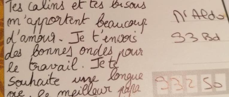 J’y retrouve cette carte si drôle et touchante que m’a écrite il y a quelques années mon fils Renardo !
