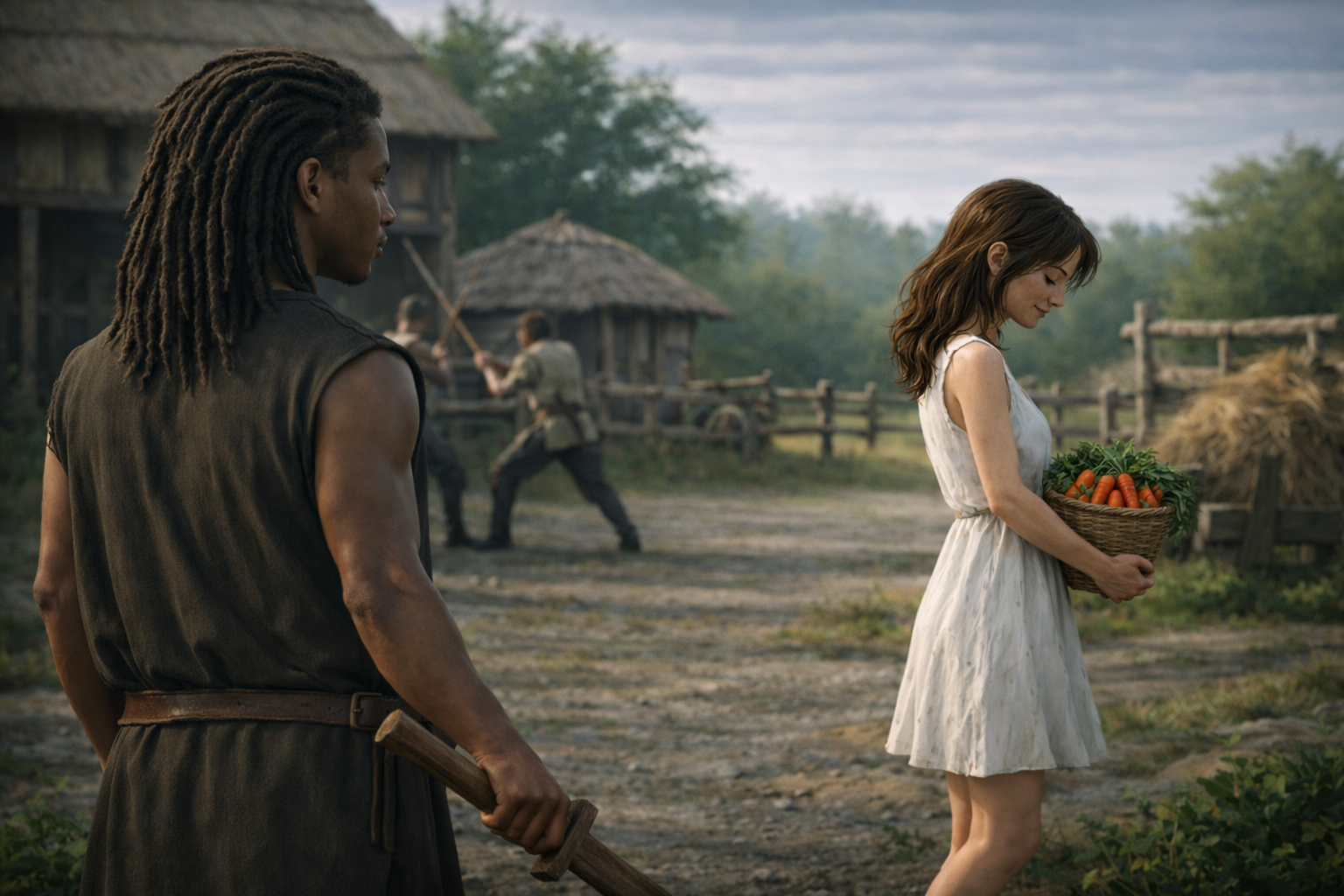À leur retour dans le courant de l’après-midi, il l’aperçut enfin : Eldria, les cheveux noués en une élégante tresse, traversait la cour en transportant un lourd panier en osier débordant de carottes fraîchement récoltées. Lorsqu’elle tourna la tête vers le groupe d’hommes nouvellement armés, leurs regards se croisèrent un court instant : Jarim lui adressa un discret signe de main, mais Eldria baissa immédiatement les yeux et hâta le pas vers sa demeure, comme si elle ne l’avait même pas vu. Déçu, Jarim ne cessa de guetter sa réapparition durant le reste de l’après-midi, tandis que Yorden, le père de Salini, s’improvisait instructeur, dispensant ses conseils au centre de la cour. Mais Eldria ne se montra plus.